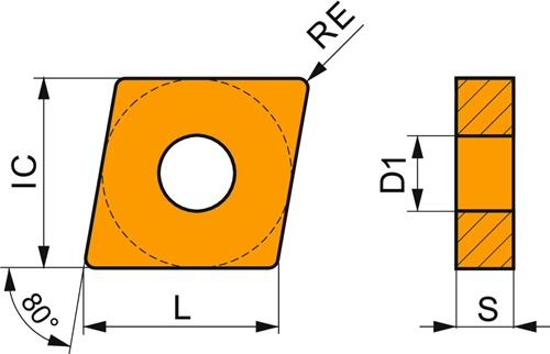 Doppelseitige negative Drehwendeschneidplatte · 80° Rhombisch mit Innenkreisdurchmesser von 12.7mm · 4.76mm Dick · 1.2mm Radius und Indexgenauigkeit nach ISO-Toleranzklasse-M · Spanbrecher NRM · im Substrat T7325 · MT-CVD beschichtet functionally graded WC-Co carbide in den ISO-Bereichen M10 -M25 und S10 -S25 · zum medium bis schruppen bearbeiten von nichtrostenden Stählen und Superlegierungen Weitere technische Eigenschaften: · Schnitttiefe max.: 7mm · Schnitttiefe min.: 1,2mm · Art der Beschichtung: MT-CVD · Bruttogewicht: 8,833g · Dicke Wendeschneidplatte - Metrisch: 4,76mm · Eckenradius - Metrisch: 1,2mm · Formcode Wendeschneidplatte: C - rhombischer 80° eingeschlossener Winkel · Fräserdesign: CNMG · Innenkreisdurchmesser - Metrisch: 12,7mm · Nettogewicht: 8,833g · Schneidkantenlänge - Metrisch: 12,9mm · Spanbrecher Herstellerbezeichnung: NRM · Spannbohrungsdurchmesser - Metrisch: 5,16mm