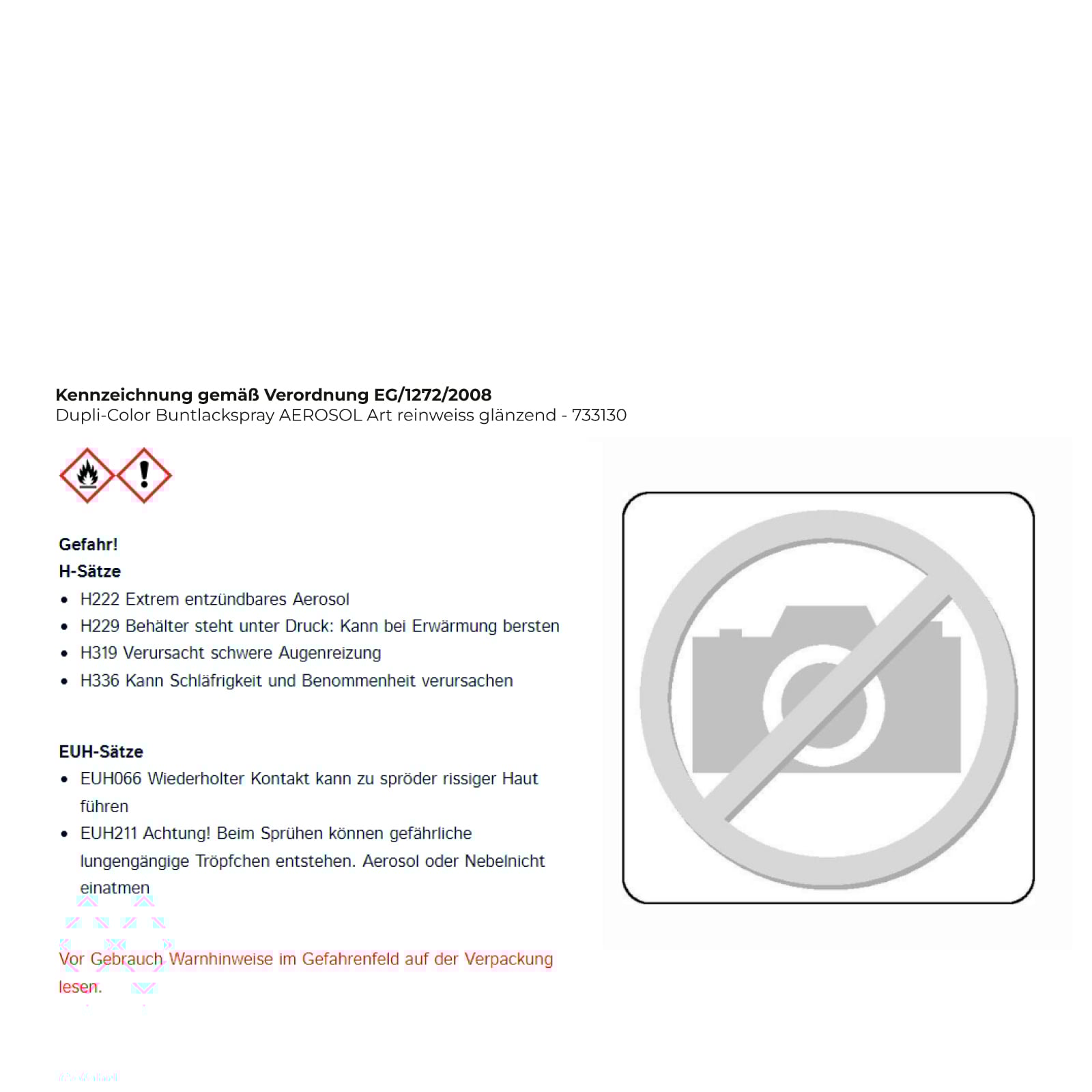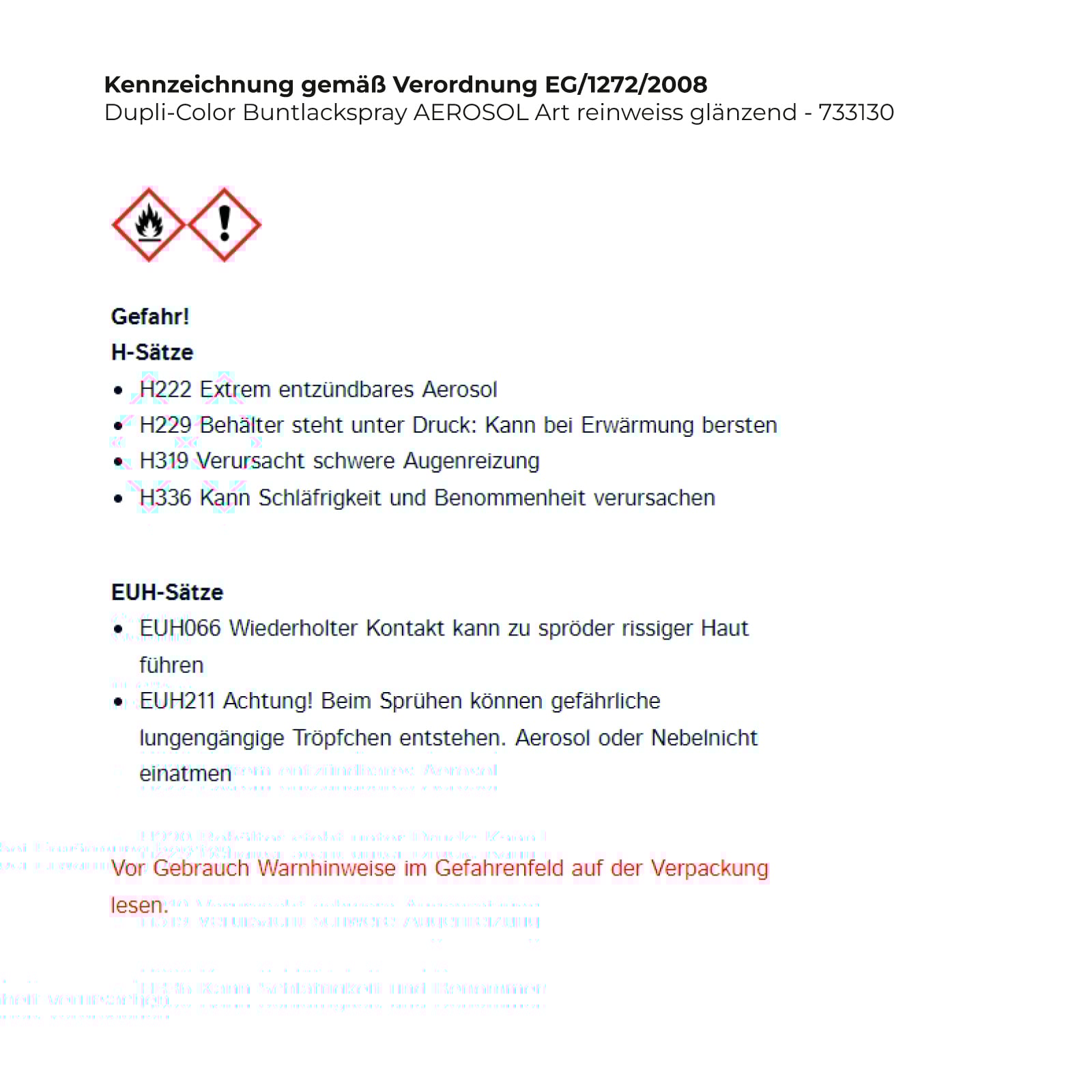 - EUH211 Achtung! Beim Sprühen können gefährliche lungengängige Tröpfchen entstehen. Aerosol oder Nebelnicht einatmen