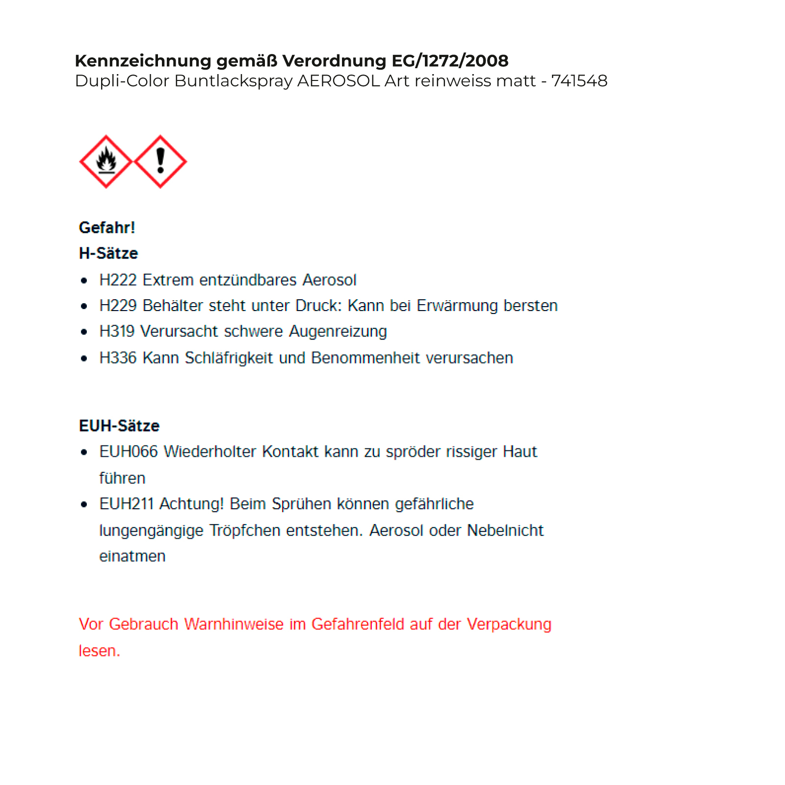 - EUH211 Achtung! Beim Sprühen können gefährliche lungengängige Tröpfchen entstehen. Aerosol oder Nebelnicht einatmen