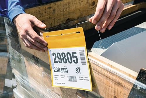 mit flexiblem Drahtbügel strapazierfähige Tasche aus PP-Folie scannertauglich und dokumentenecht auch eignet für den Außeneinsatz durch Staub- und Regenschutzklappe zur idealen Befestigung an Holzaufsatzrahmen und Palettenkartons Vorderseite transparent VE : 50 Stück für Format: DIN A5 quer Breite: 210 mm Farbe: dunkelblau Ausführung: mit flexiblem Drahtbügel Höhe: 148 mm