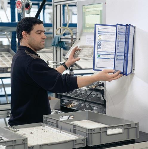 Komplett-Set mit Profilrahmen Metall-Wandhalter mit 5 Sichttafeln Ausführung zur Aufnahme von Brandschutzverordnungen - rot, Betriebsanweisungen für Maschinen - dunkelblau oder Betriebsanweisungen gem. Gef.SToffV - orange Anzahl Sichttafeln: 5 Farbe: dunkelblau Marke: DURABLE Ausführung: mit Profilrahmen Material: Metall