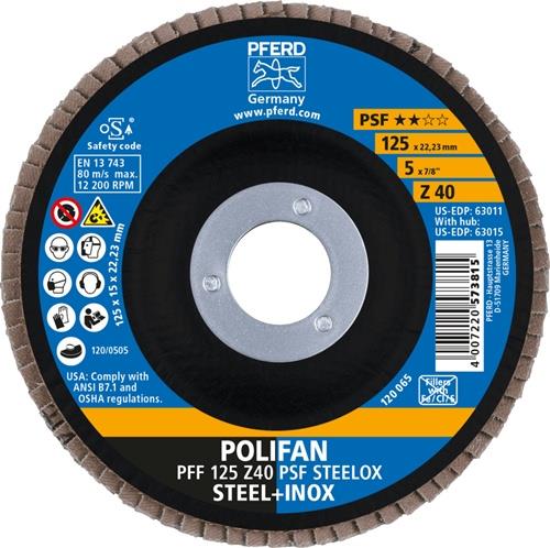 Zirkonkorund Z · für Stahl und Edelstahl (INOX) · Bohrung 22,23 mm Ø Weitere technische Eigenschaften: · Antriebsart: Winkelschleifer · Aufnahmesystem: Bohrung · Ausführung: keine Angabe · Bearbeitbare Werkstoffe: Edelstahl (INOX), Stahl · Bearbeitungsaufgaben: Anfasen, Flächenschliff, Entgraten, Stufenweises Feinschleifen, Schweißnahtbearbeitung · Form: PFF / A / T27 · Hinweis: PFERDERGONOMICS empfiehlt POLIFAN-Fächerscheiben, um die beim Einsatz entstehende Vibrations-, Lärm- und Staubentwicklung nachhaltig zu senken und den Arbeitskomfort spürbar zu verbessern. PFERDEFFICIENCY empfiehlt POLIFAN-Fächerscheiben für perfekte Ergebnisse in kürzester Zeit. · Ø Bohrung: 22,23mm · Vorteile: Schneller Arbeitsfortschritt und hohe Wirtschaftlichkeit durch hohe Zerspanungsleistung. Auch für leistungsschwache Winkelschleifer geeignet. Gute Standzeit.