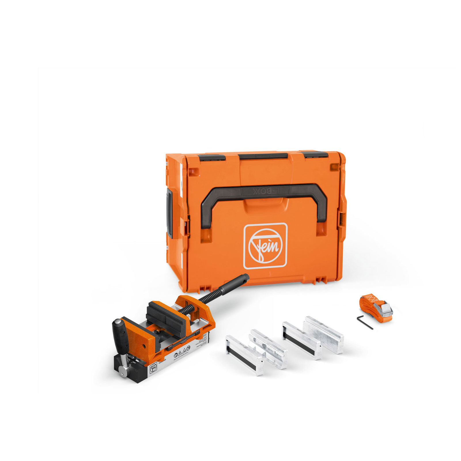 1x Fein Magnetschraubstock mit Backenbreite von 100 mm FEIN VersaMAG Schraubstock Set inklusive Schutzbacken aus Aluminium1x Fein Permanentmagnet1x Fein Montageplatte1x Fein Schraubstock1x Fein Innensechskantschlüssel 3 mm1x Fein Zurrgurt2x Fein Aluminiumschutzbacken B (Blank)2x Fein Aluminiumschutzbacken P (Prisma) bis ⌀ 30 mm 1x Fein Kunststoff-Werkzeugkoffer (L-BOXX 238)1x Fein Inlay FEIN VersaMAG Schraubstock Set