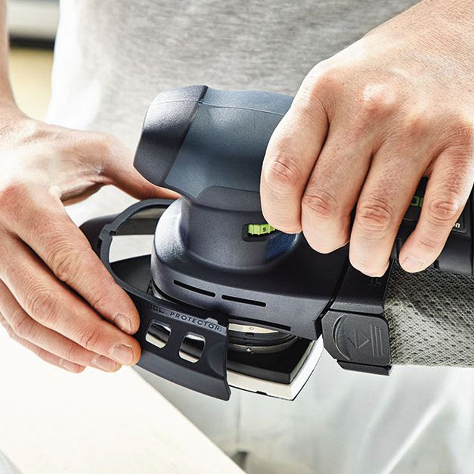 - Mit plug it-Netzadapter als Schleifmaschine mit unbegrenzter Laufzeit im elektrischen Dauerbetrieb - ideal in Kombination mit einem Festool Absaugmobil im Innenbereich