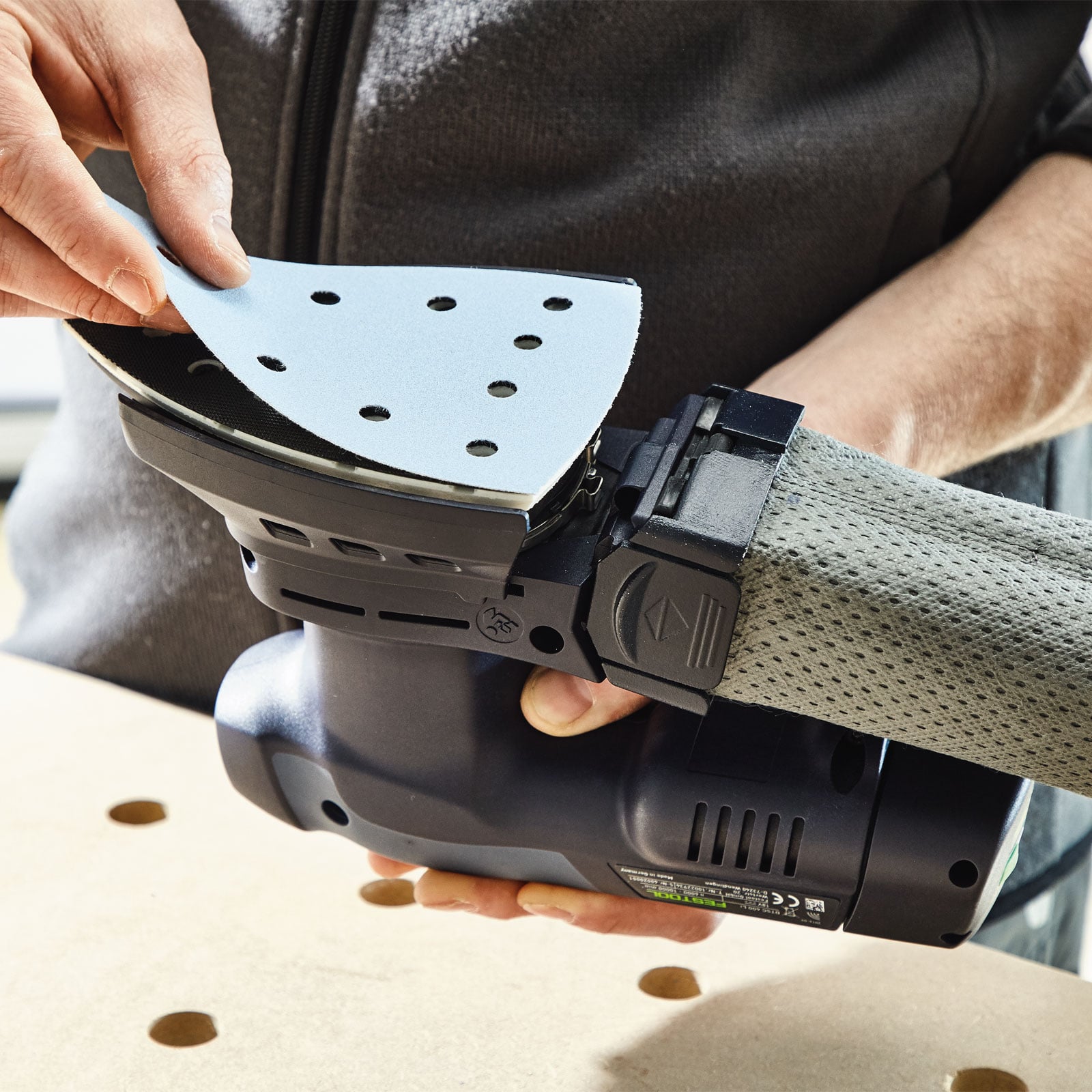 - Mit plug it-Netzadapter als Schleifmaschine mit unbegrenzter Laufzeit im elektrischen Dauerbetrieb - ideal in Kombination mit einem Festool Absaugmobil im Innenbereich