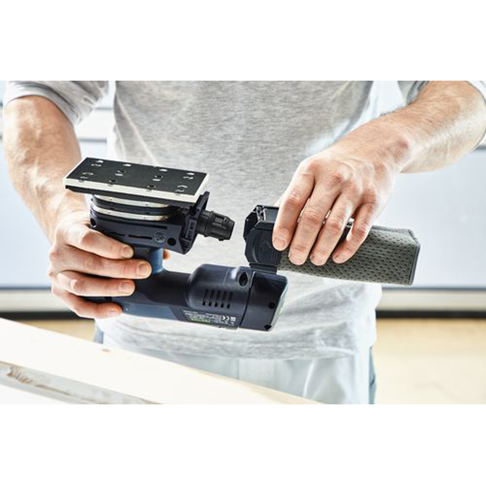 - Mit plug it-Netzadapter als Schleifmaschine mit unbegrenzter Laufzeit im elektrischen Dauerbetrieb - ideal in Kombination mit einem Festool Absaugmobil im Innenbereich