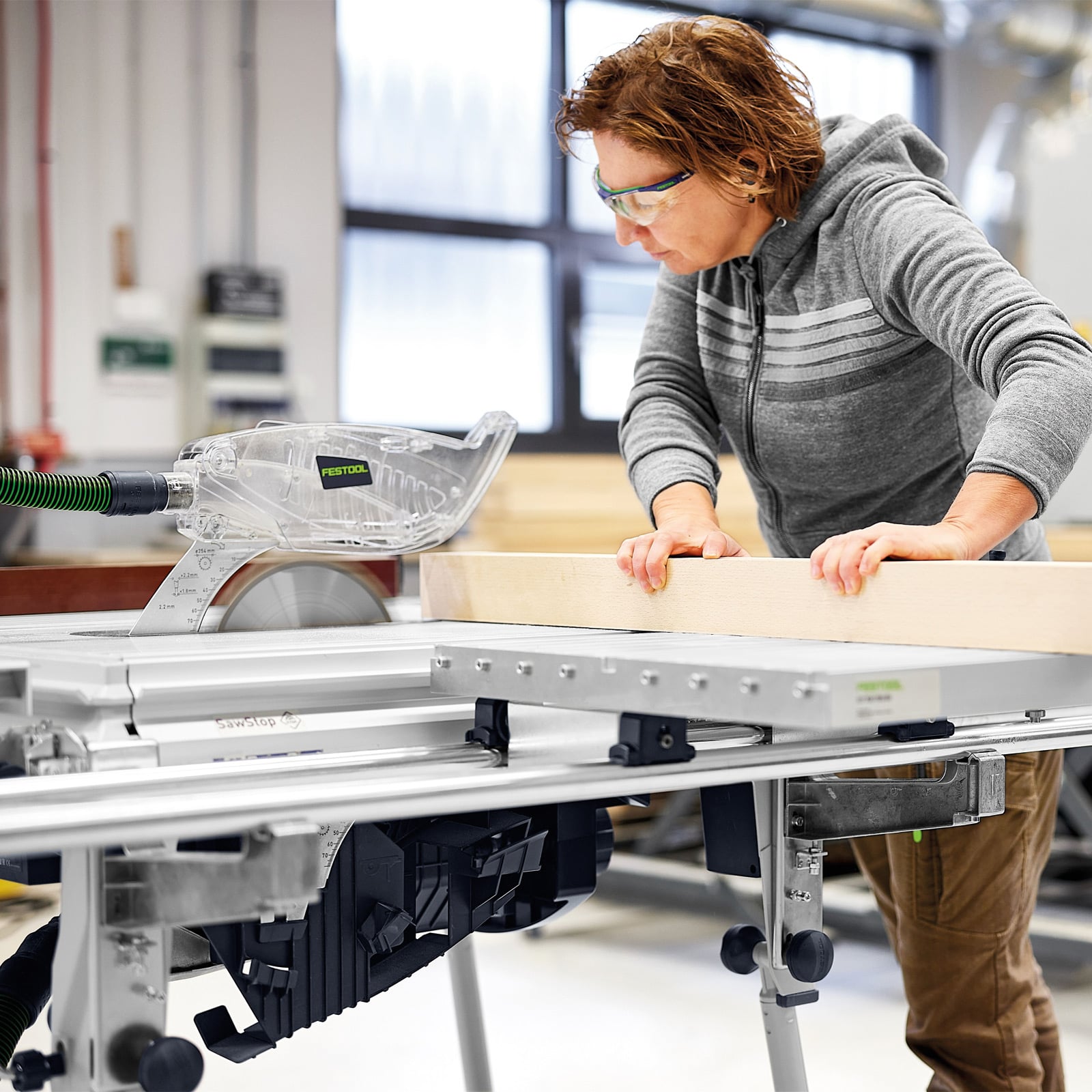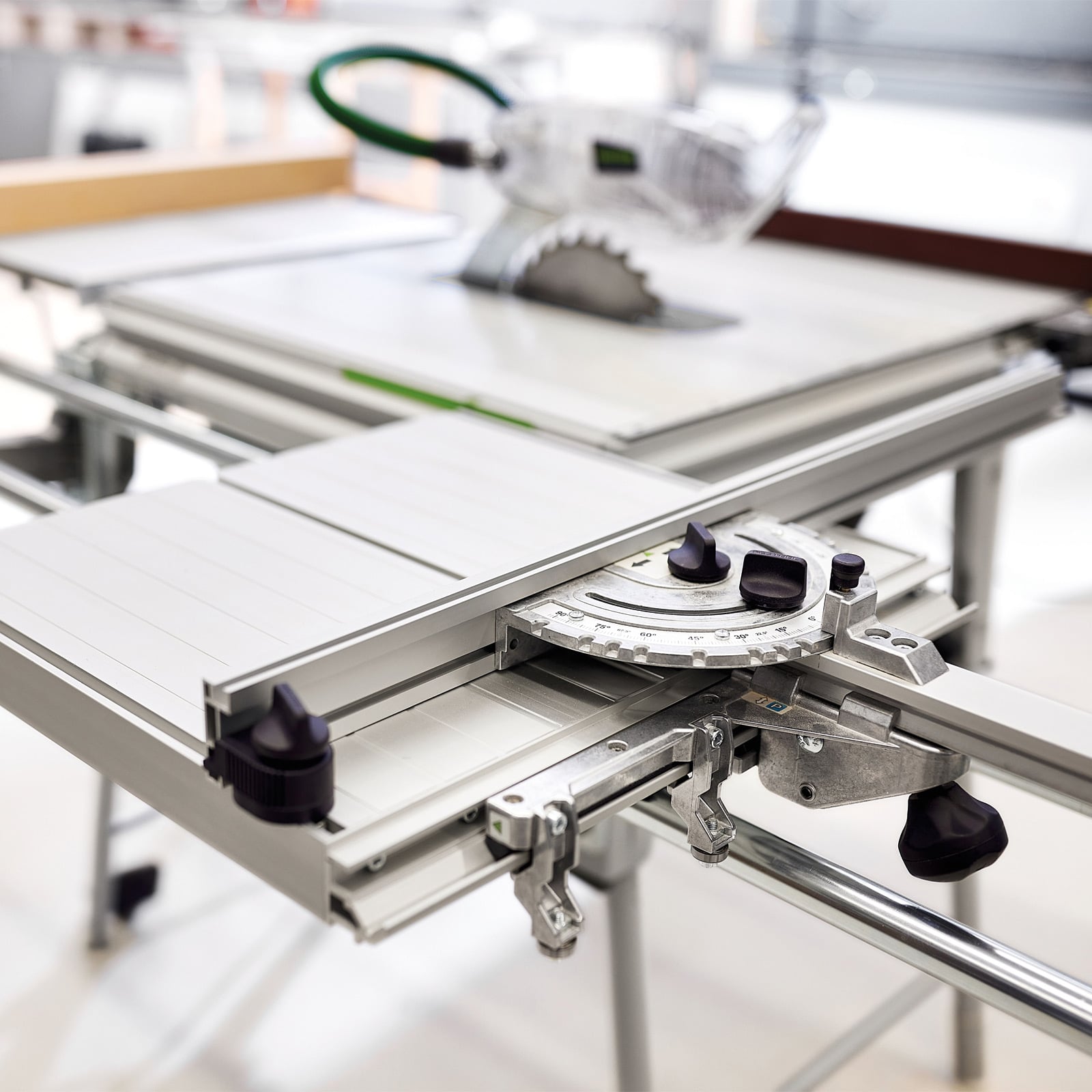 Einfach große Werkstücke am Sägeblatt der TKS 80 durchschieben - fertig! Mit der verlängerten Führungseinheit sägst du große Plattenwerkstoffe präzise und leicht zu. Zugleich dient dir der Schiebetisch als zusätzliche Verbreiterung auf der linken Seite der Tischkreissäge. Mit dem dazugehörigen Winkel-Rastanschlag führst du exakt rechtwinklige Schnitte durch und auch andere beliebige Winkel stellst du einfach und genau ein.