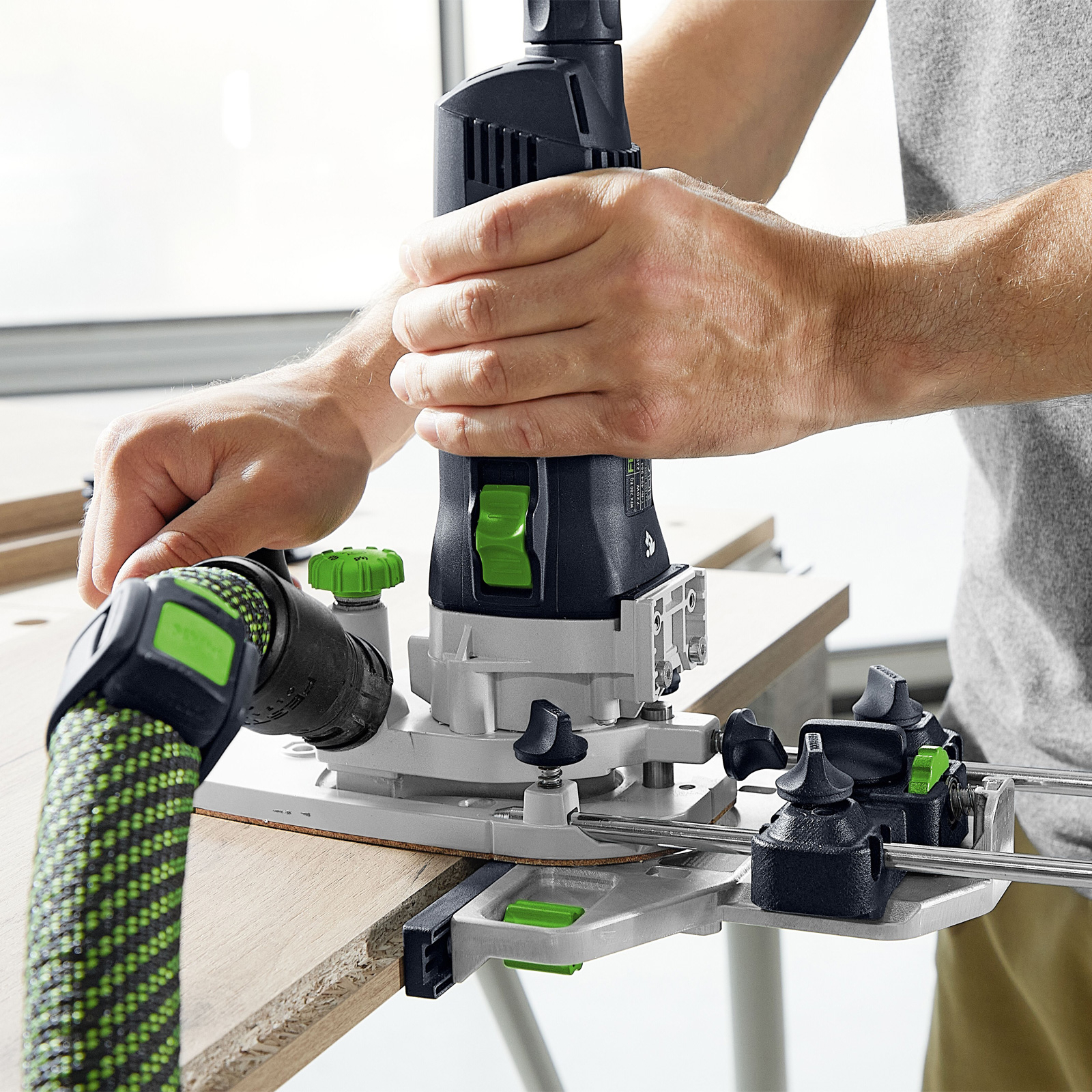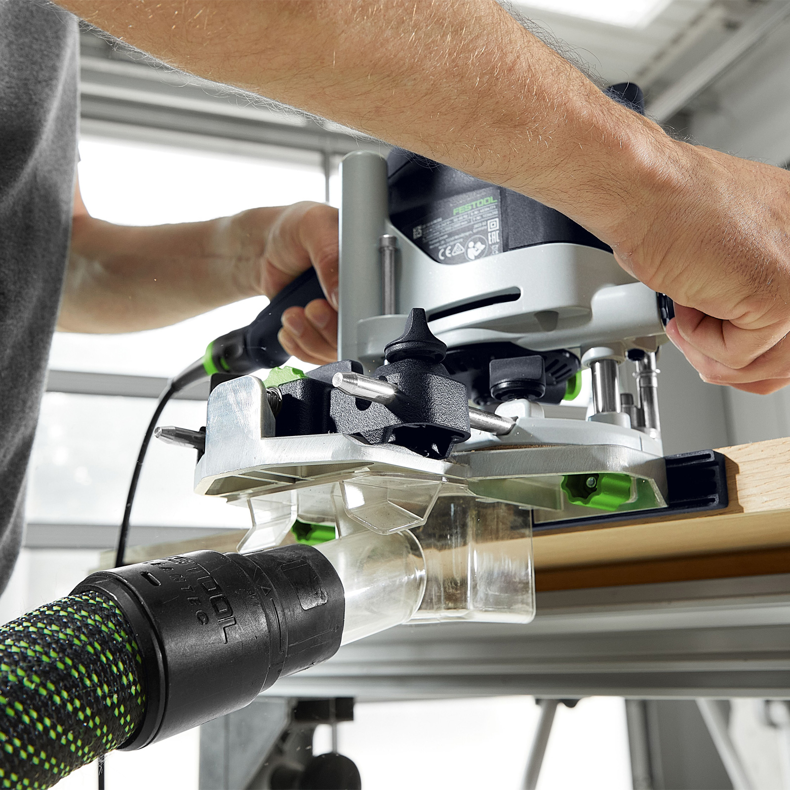 - Sauber: Die zusätzliche Absaughaube ermöglicht einen Schlauchanschluss unterhalb des Seitenanschlages (im OF 1010 Zubehör-Systainer enthalten)