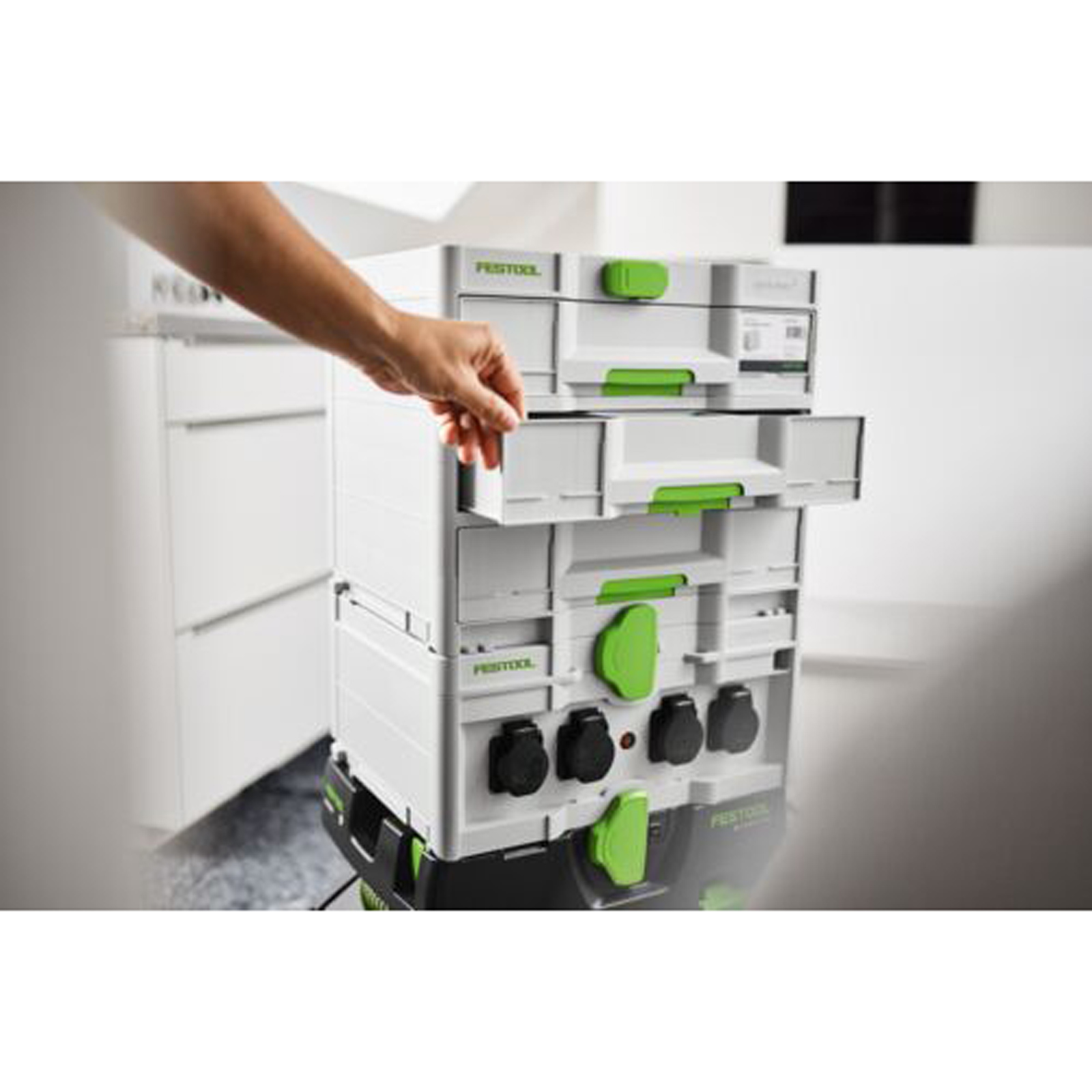 - Systainer mit integrierten Steckdosen und 10 m Kabel zur Nutzung als Stromverteiler auf der Baustelle, vollständig integrierbar ins Systainer-System.