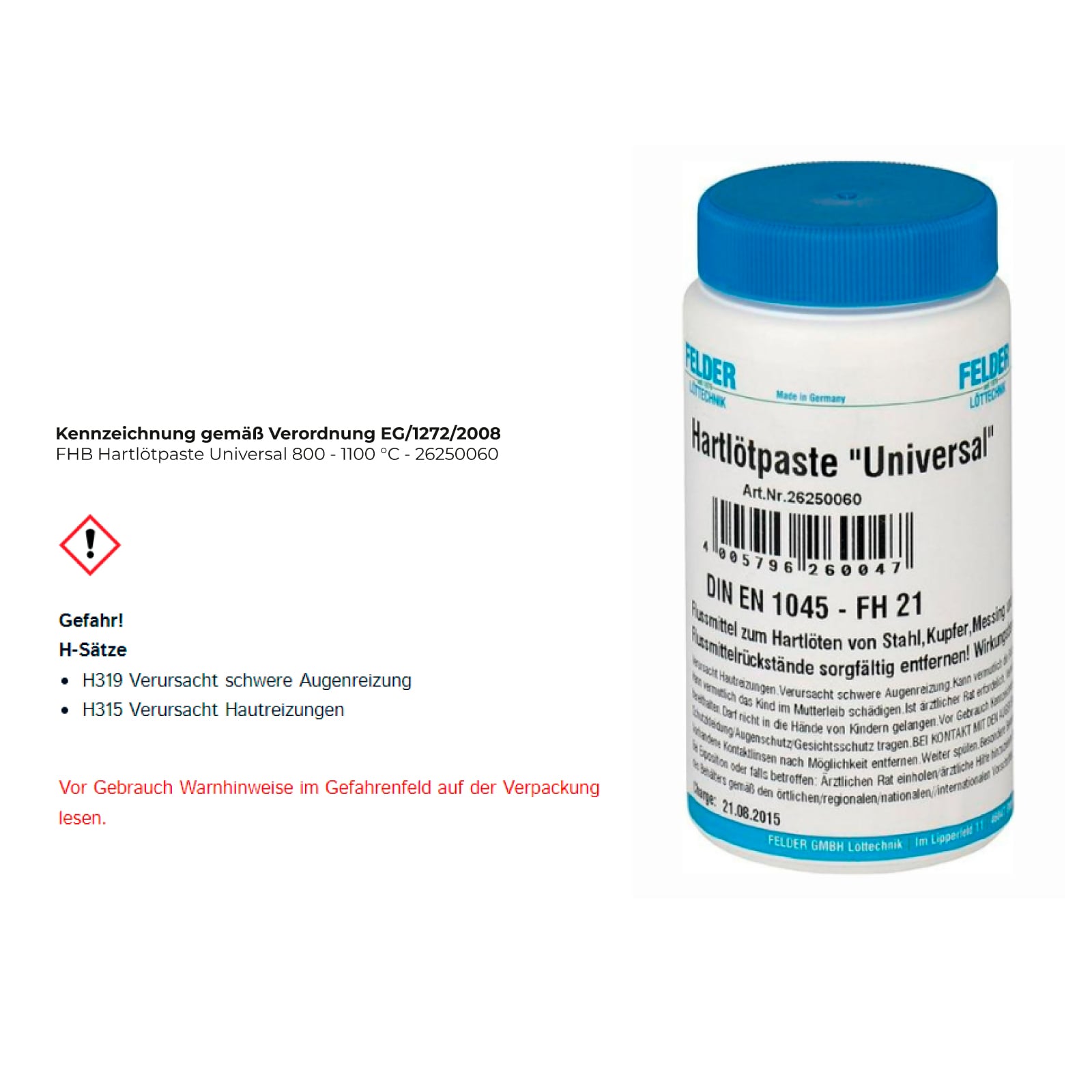 Hartlötflussmittel zum Hartlöten von Kupfer, Kupferlegierungen, Messing, Bronze, Stahl und verzinktem Stahlblech DIN EN 1045-FH 21