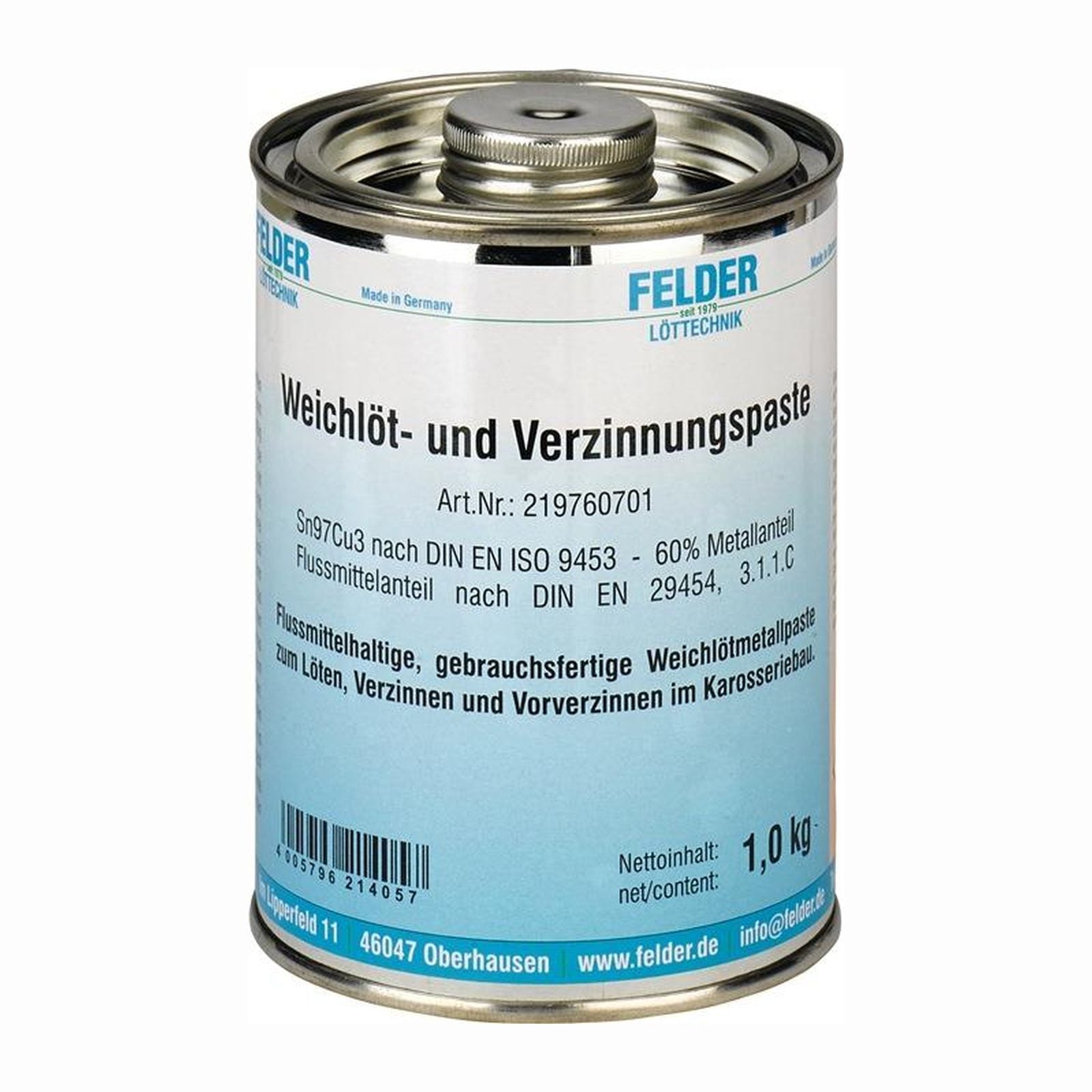 Eigenschaften und Angwendungsgebiete u. a. für die Verzinnung von Karosserie Metallanteil: 60 - 70 % gebrauchsfertige Metallpaste Legierungen S-Sn97Cu3 nach DIN EN ISO 9453 Das Aufrühren der Paste vor dem Gebrauch ist nicht erforderlich Flussmittel nach DIN EN 29454.1,3.1.C (F-SW 21)