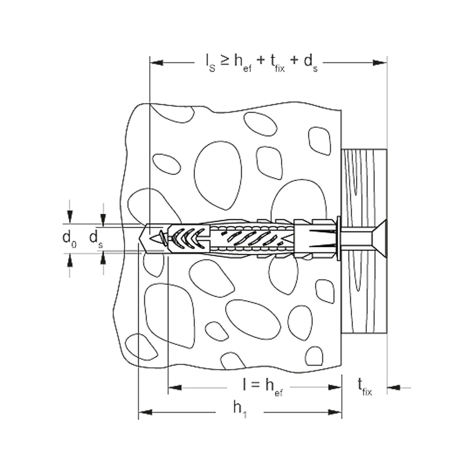 - Die erforderliche Schraubenlänge ergibt sich aus Dübellänge + Anbauteildicke + 1 x Schraubendurchmesser.