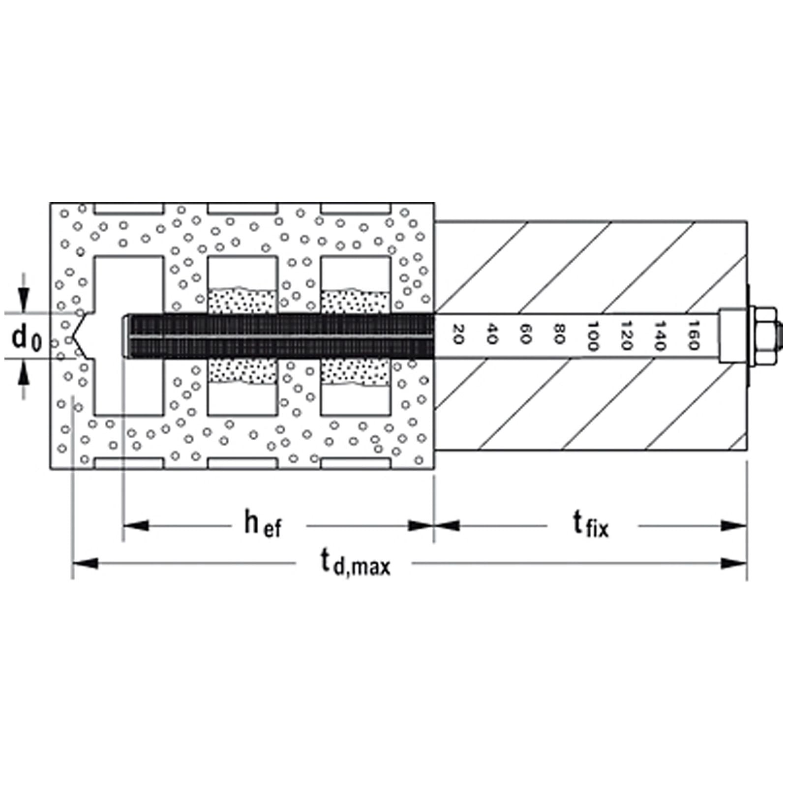 Das fischer Injektions-Durchsteckankerhülse FIS Set 18 x 130/200 M 12/200 ist die Systemkomponente für die Verwendung der fischer Injektionsmörtel in Lochstein-Mauerwerk in der Durchsteckmontage. Die Ankerhülse wird dazu mit der Skalierung und dem verschiebbaren Rand auf die Dicke des Anbauteils angepasst und abgeschnitten. Der Injektionsmörtel wird vom Grund der Ankerhülse verfüllt. Beim Setzen der Ankerstange wird der Mörtel durch die Gitterstruktur gedrückt und verbindet sich im Formschluss mit dem Lochstein. Dadurch wird die Last in den Baustoff geleitet. Mit der Injektions- Durchsteckankerhülse können auch nicht tragende Schichten überbrückt werden. Die Durchsteckankerhülse FIS H K ist für die Befestigung von Holzkonstruktionen, Carports oder Markisen geeignet.