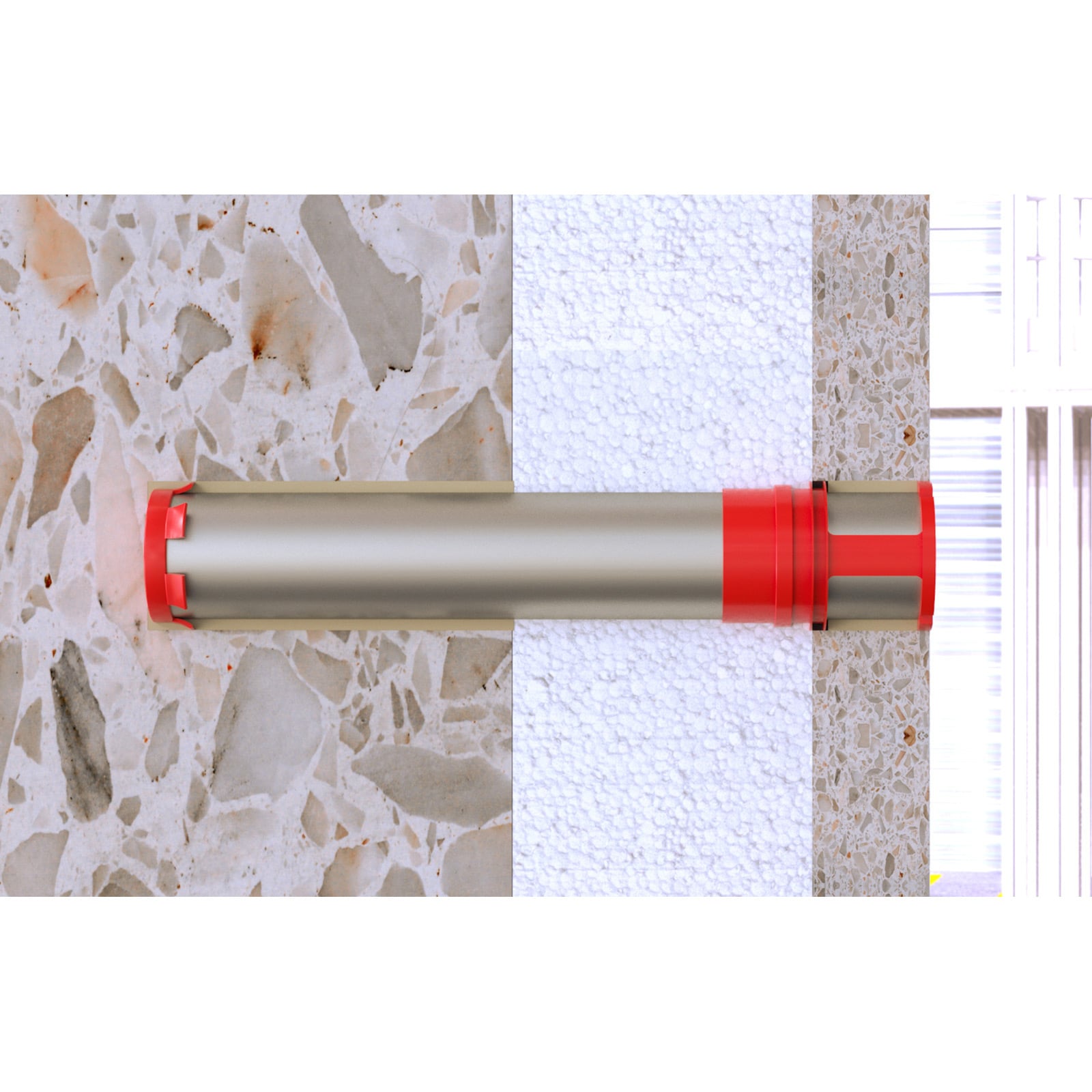 - Die rote Kunststoffummantelung schützt die Dämmung vor dem Eindringen des Mörtels.
