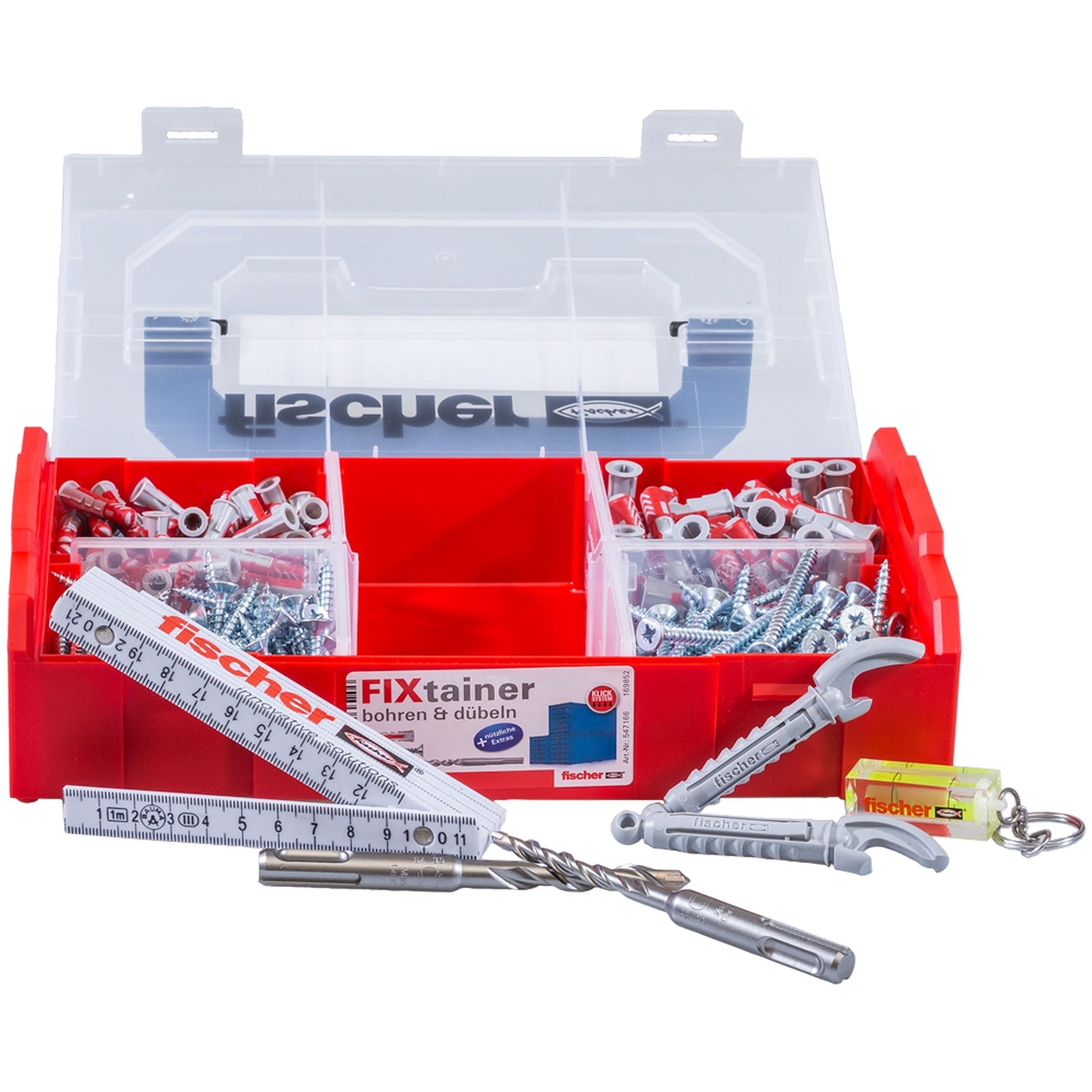 Der FixTainer bohren & dübeln enthält die neue Leistungsklasse - den fischer DuoPower vorsortiert in den Abmessungen 6 x 30 und 8 x 40. Dazu die passenden Schrauben und der jeweils passende Hammerbohrer SDS Plus Pointer II. Nützliche Extras wie einen fischer Meterstab 1 Meter, zwei Flaschenöffner SX und einen Schlüsselanhänger Mini Wasserwage runden das praktische Set ab.