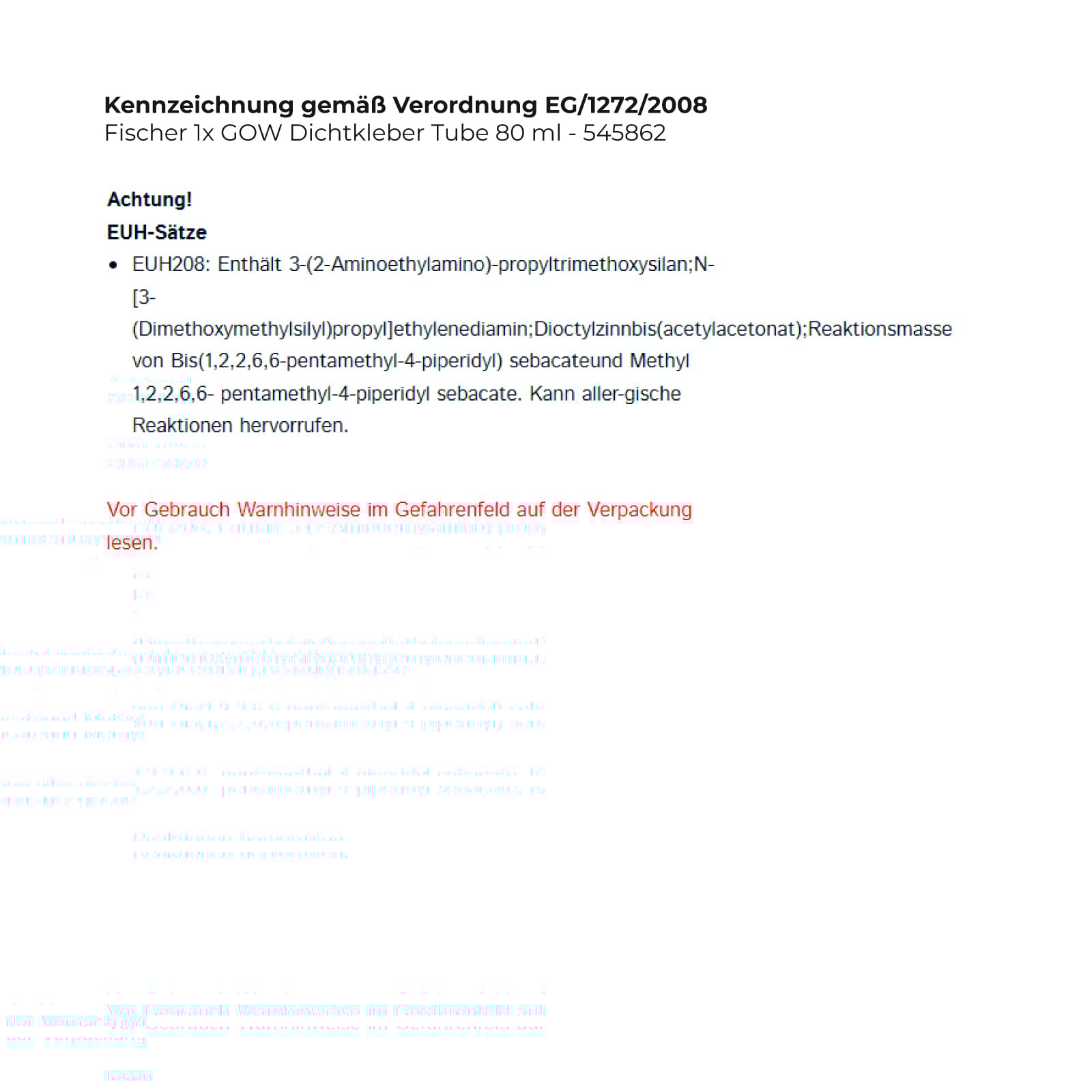 - EUH208: Enthält 3-(2-Aminoethylamino)-propyltrimethoxysilan;N-[3-(Dimethoxymethylsilyl)propyl]ethylenediamin;Dioctylzinnbis(acetylacetonat);Reaktionsmasse von Bis(1,2,2,6,6-pentamethyl-4-piperidyl) sebacateund Methyl 1,2,2,6,6- pentamethyl-4-piperidyl sebacate. Kann aller-gische Reaktionen hervorrufen.