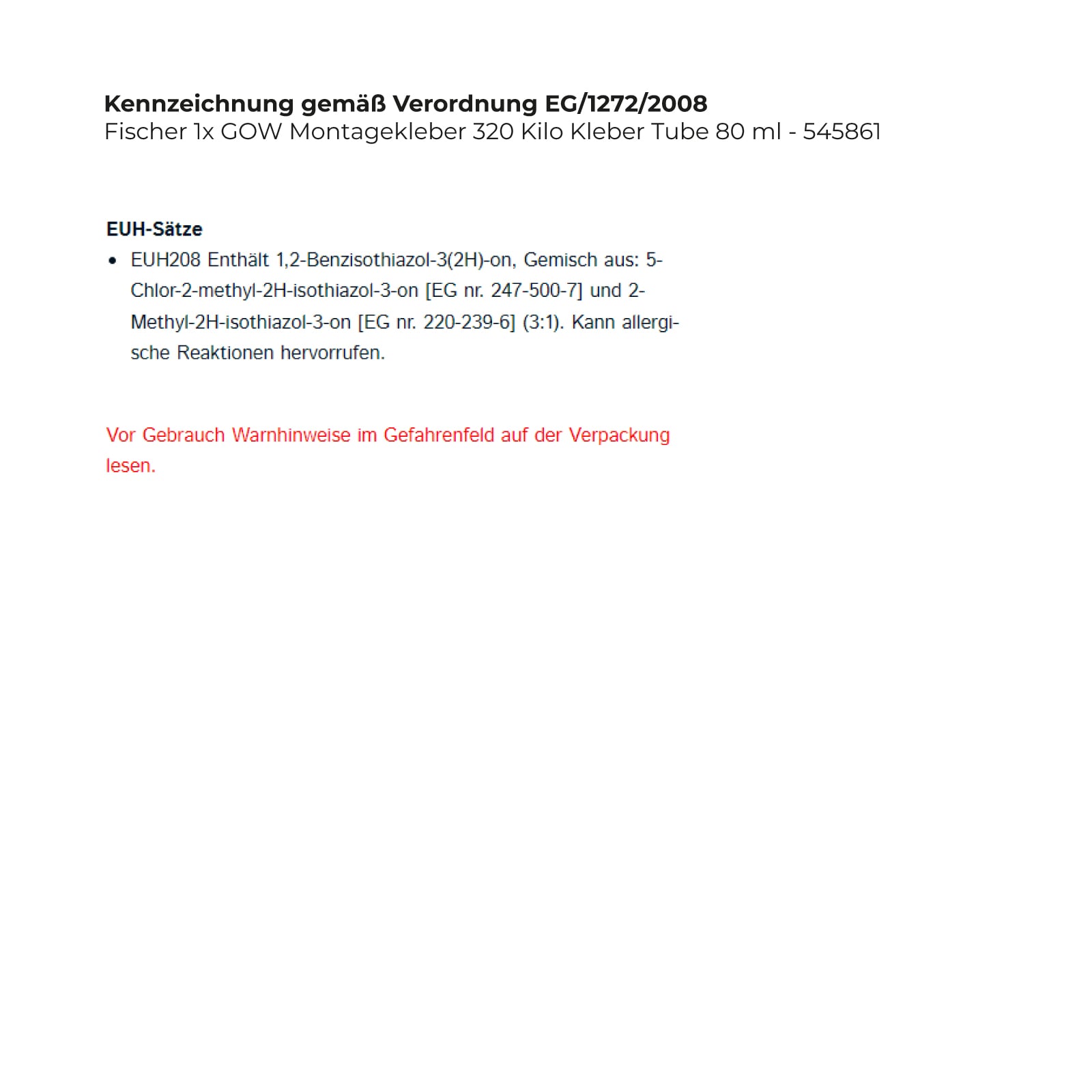 - 1x Fischer GOW Montagekleber 320 Kilo Kleber Tube 80 ml