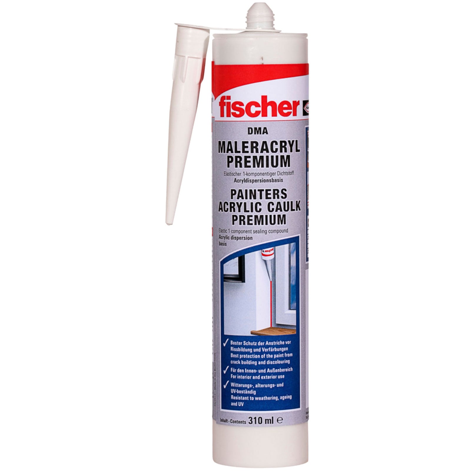 fischer Maleracryl Premium DMA eignet sich beispielsweise für die Verarbeitung in Beton, Gips, Holz, Mauerwerk und Metall. Mit dem Dichtstoff werden Anschlussfugen im Innenbereich zwischen Holz-, Kunststoff- und Metallfenstern und Wand abgedichtet. Auch Fugen im Trocken- und Innenausbau, zwischen Treppe und Wand, Decke und Wand werden mit dem fischer Maleracryl Premium DMA geschlossen. Der Dichtstoff wirkt nicht korrosiv und bietet sehr gute Witterungs-, Alterungs- und UV-Beständigkeit. Er kann bei Temperaturen von +5 °C bis +40 °C verarbeitet werden und ist temperaturbeständig von -20 °C bis +75 °C.