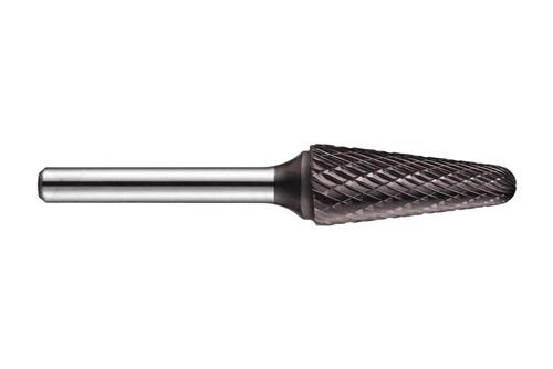 Kugelkegel-Frässtift (Form L) · Durchmesser 12.7mm mit 32mm Schnittlänge · 77mm Gesamtlänge und 6mm Schaft · VHM mit gehärtetem Stahlschaft und TiAlN Beschichtung · DC doppelseitigem Schnitt mit enger Zahnteilung zum Vergrößern von Löchern · Abrunden von Kanten und Oberflächenveredeln in engen Winkeln oder anderen schwer zugänglichen Bereichen in Stahl und Stahlguss · Edelstahl · Gusseisen · Kupfer oder Kupferlegierungen · Hochwarmfeste Legierungen · gehärtete Materialien