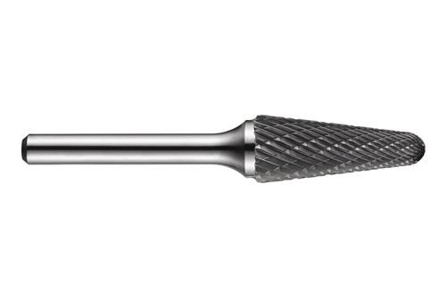 Kugelkegel-Frässtift (Form L) · Durchmesser 12.7mm mit 32mm Schnittlänge · 77mm Gesamtlänge und 6mm Schaft · VHM mit gehärtetem Stahlschaft und blanker Oberfläche · DC doppelseitigem Schnitt mit enger Zahnteilung zum Vergrößern von Löchern · Abrunden von Kanten und Oberflächenveredeln in engen Winkeln oder anderen schwer zugänglichen Bereichen in Stahl und Stahlguss · Edelstahl · Gusseisen · Kupfer oder Kupferlegierungen · Hochwarmfeste Legierungen · gehärtete Materialien
