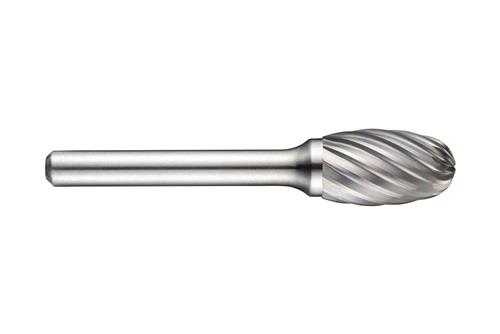 Ovaler Frässtift (Form E) · Durchmesser 9.6mm mit 16mm Schnittlänge · 60mm Gesamtlänge und 6mm Schaft · VHM mit gehärtetem Stahlschaft und blanker Oberfläche · VA einseitigem Schnitt mit mittlerer Zahnteilung zur runden Kantenformung in Edelstahl