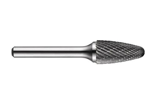 Abgerundeter Tannen-Frässtift (Form F) · Durchmesser 6mm mit 18mm Schnittlänge · 50mm Gesamtlänge und 6mm Schaft · Vollhartmetall mit blanker Oberfläche · DC doppelseitigem Schnitt mit enger Zahnteilung zum bearbeiten von Konturen mit mehreren Winkeln · Abrunden von Kanten und Schneiden in schwer zugängliche Bereichen in Stahl und Stahlguss · Edelstahl · Gusseisen · Kupfer oder Kupferlegierungen · Hochwarmfeste Legierungen · gehärtete Materialien