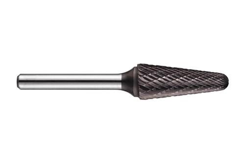 Kugelkegel-Frässtift (Form L) · Durchmesser 3mm mit 14mm Schnittlänge · 38mm Gesamtlänge und 3mm Schaft · Vollhartmetall mit TiAlN Beschichtung · DC doppelseitigem Schnitt mit enger Zahnteilung zum Vergrößern von Löchern · Abrunden von Kanten und Oberflächenveredeln in engen Winkeln oder anderen schwer zugänglichen Bereichen in Stahl und Stahlguss · Edelstahl · Gusseisen · Kupfer oder Kupferlegierungen · Hochwarmfeste Legierungen · gehärtete Materialien
