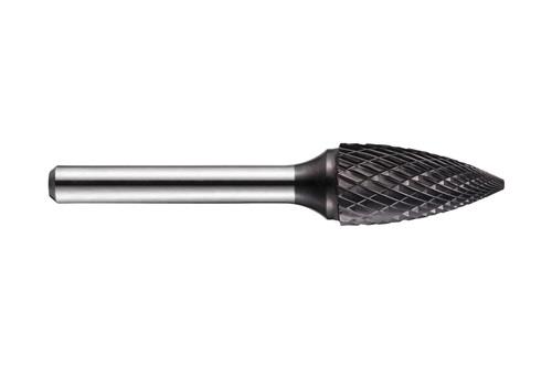 Spitzer Tannen-Frässtift (Form G) · Durchmesser 3mm mit 14mm Schnittlänge · 38mm Gesamtlänge und 3mm Schaft · Vollhartmetall mit TiAlN Beschichtung · DC doppelseitigem Schnitt mit enger Zahnteilung zum bearbeiten von Konturen mit mehreren Winkel und Schneiden von engen Winkeln in schwer zugänglichen Bereichen in Stahl und Stahlguss · Edelstahl · Gusseisen · Kupfer oder Kupferlegierungen · Hochwarmfeste Legierungen · gehärtete Materialien