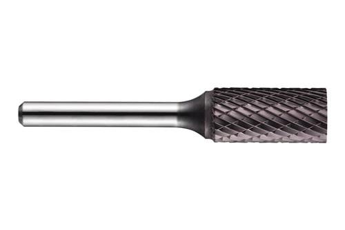 Zylindrischer Frässtift ohne Stirnverzahnung (Form A) · Durchmesser 6mm mit 18mm Schnittlänge · 50mm Gesamtlänge und 6mm Schaft · Vollhartmetall mit TiAlN Beschichtung · DC doppelseitigem Schnitt mit enger Zahnteilung zum bearbeiten von Oberflächen in Stahl und Stahlguss · Edelstahl · Gusseisen · Kupfer oder Kupferlegierungen · Hochwarmfeste Legierungen · gehärtete Materialien