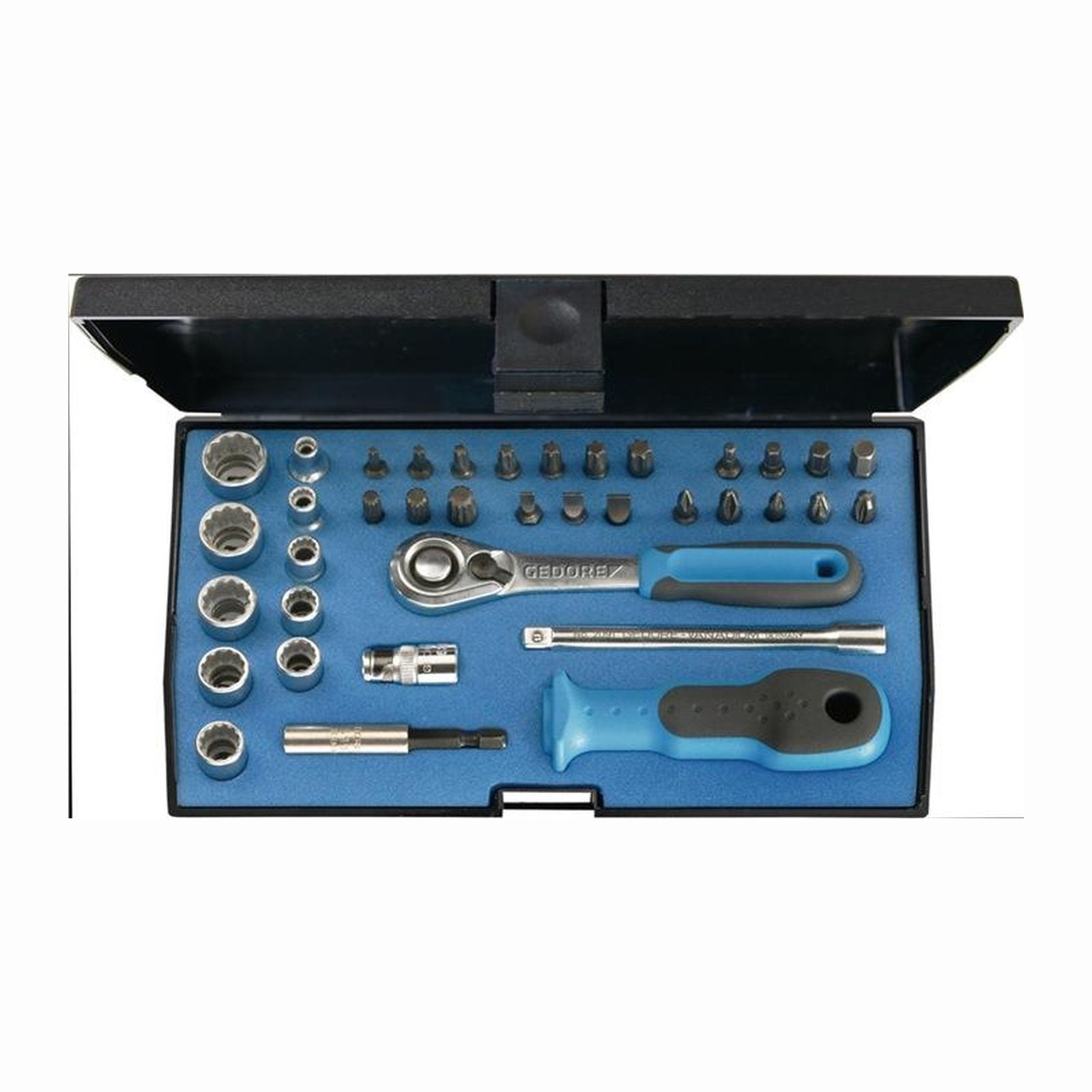 - 1x Gedore Hebel-Umschaltknarre (40 Zähne) mit 2-Komponenten-Griff und Nussverriegelungsfunktion mit Druckknopfauslösung