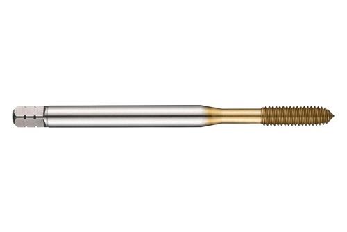 Gewindeformer · Anschnittform C mit 2-3xP Gewindeanschnitt · ISO-Metrisches Gewinde M2.5 mit 0.45 mm Steigung und 6HX Toleranzklasse · Abmessungen nach DIN 2174 Standard mit 2.8mm Schaft und 2.1mm Vierkantantrieb · HSSE-Co mit TiN Beschichtung 3xD Durchgangs- und Sacklochgewinde in Baustahl · Kohlenstoffstahl und legierter · Ferritischer · Martensitischer und Austenitischer Edelstahl und Reinaluminium oder Aluminiumguss Weitere technische Eigenschaften: · Gewindelänge: 8mm · Schaft-Ø: 2.8