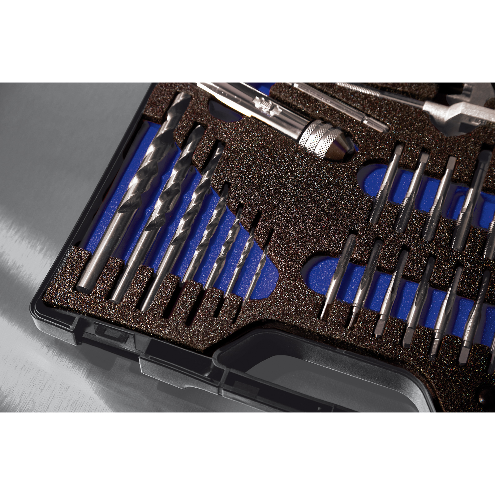 Handgewindebohrer (Vor-, Mittel-, Fertigschneider) DIN 352 HSS M3 - M4 - M5 - M6 - M8 - M10 - M12 Schneideisen DIN223 HSS M3 - M4 - M5 - M6 - M8 - M10 - M12 Führungen DIN223 M3 - M4 - M5 - M6 - M8 - M10 - M12 Verstellbares Windeisen DIN1814 GD (Zinkdruckguss) Gr. 1 + Gr. 2 Schneideisenhalter DIN EN 22568 GD (Zinkdruckguss) 20x5 / 20x7 / 25x9 / 30x11 / 38x14 Spiralbohrer DIN338 HSS-G Typ N Ø 2,5mm / 3,3mm / 4,2mm / 5,0mm / 6,8mm / 8,5mm / 10,2mm Führungen Nr. 1 - 2 - 3 - 4 - 5 - 6 - 7 Werkzeughalter Gr. 2 Schraubendreher Gewindelehre inkl. Handbuch Gewindeschneiden