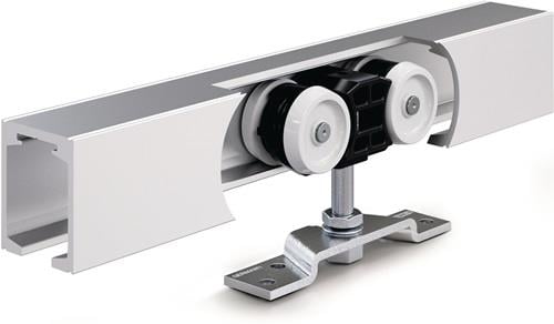 - Lieferumfang: Laufschiene für direkte Deckenmontage bzw. Wandbefestigung, 2 Rollenwagen mit Aufhängerschrauben, 2 Trägerplatten, 1 Bodenführung, 2 Rohrpuffer mit 1 Feststellfeder Sonderlängen und Zubehör auf Anfrage