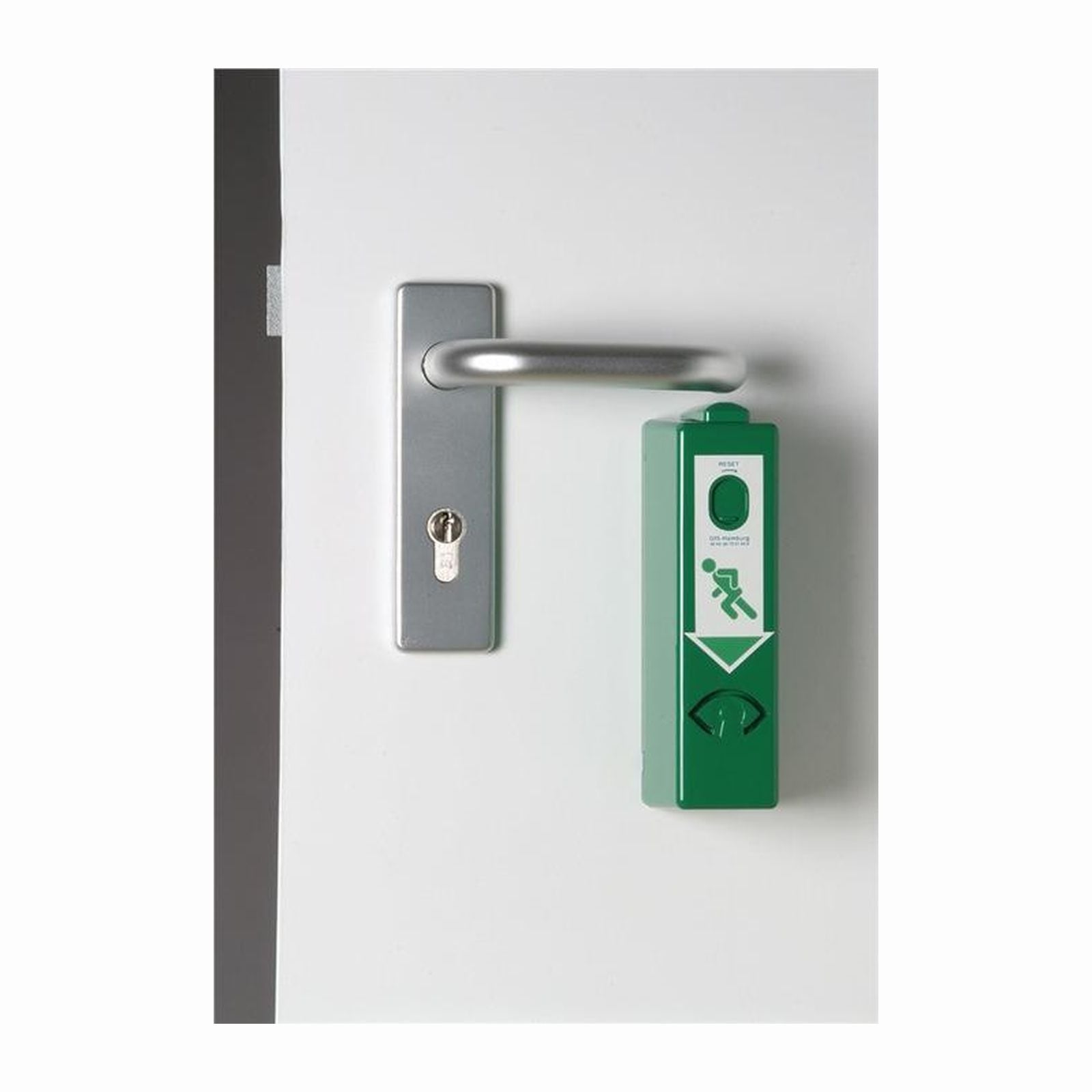 Einhandbedienung DIN EN 179 zur Überwachung von Fluchttüren in Rettungswegen Profil-Halbzylinder inkl. 2 Schlüssel lauter Alarmton 95 dB/1 m aus Metall (Zinkdruckguss) grün lackiert (RAL 6029) 9 V Batterie 2 Schlüssel 1 kleines Piktogramm für den Türwächter mit Richtungspfeil, langnachleuchtend 1 großes Piktogramm für die Tür, langnachleuchtend mit Befestigungsschrauben 5 Jahre Merkmalegarantie Art.-Nr. 3000250538 (Typ 990 100) mit zusätzlichem Voralarm beim Antippen