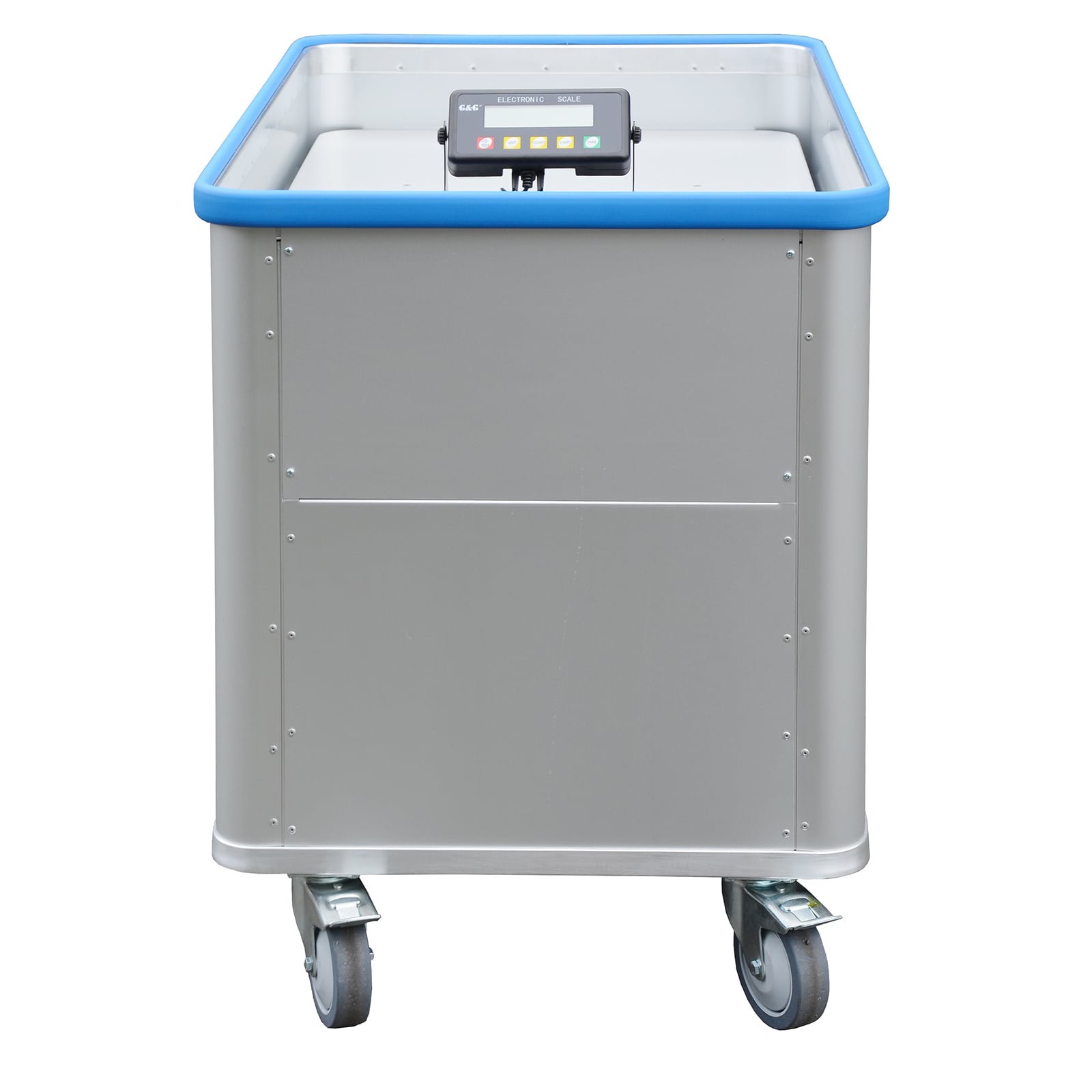 - Radgehäuse aus verzinktem Stahl, Räder mit spurloser Vollgummibereifung, Rollenlagerung und Fadenschutz