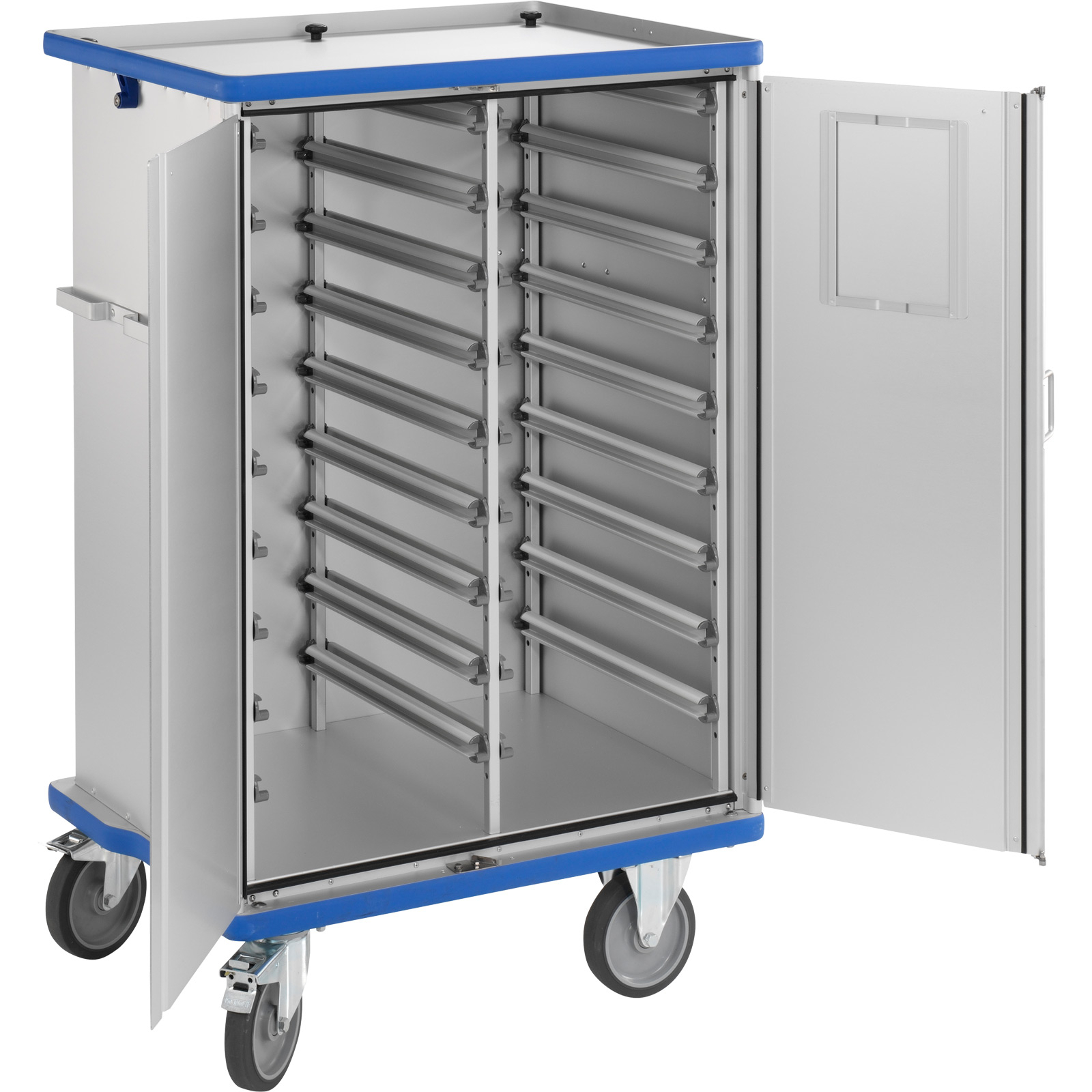 - Umlaufender, abriebfester, blauer PVC-Stoßpuffer am oberen und unteren Wagenrand