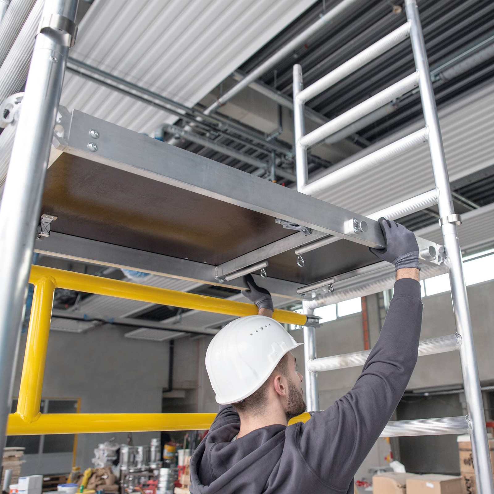 - Bei niedriger gelegenen Arbeitsplätzen lässt sich das Gerüst auch flexibel in geringeren Aufbauhöhen montieren