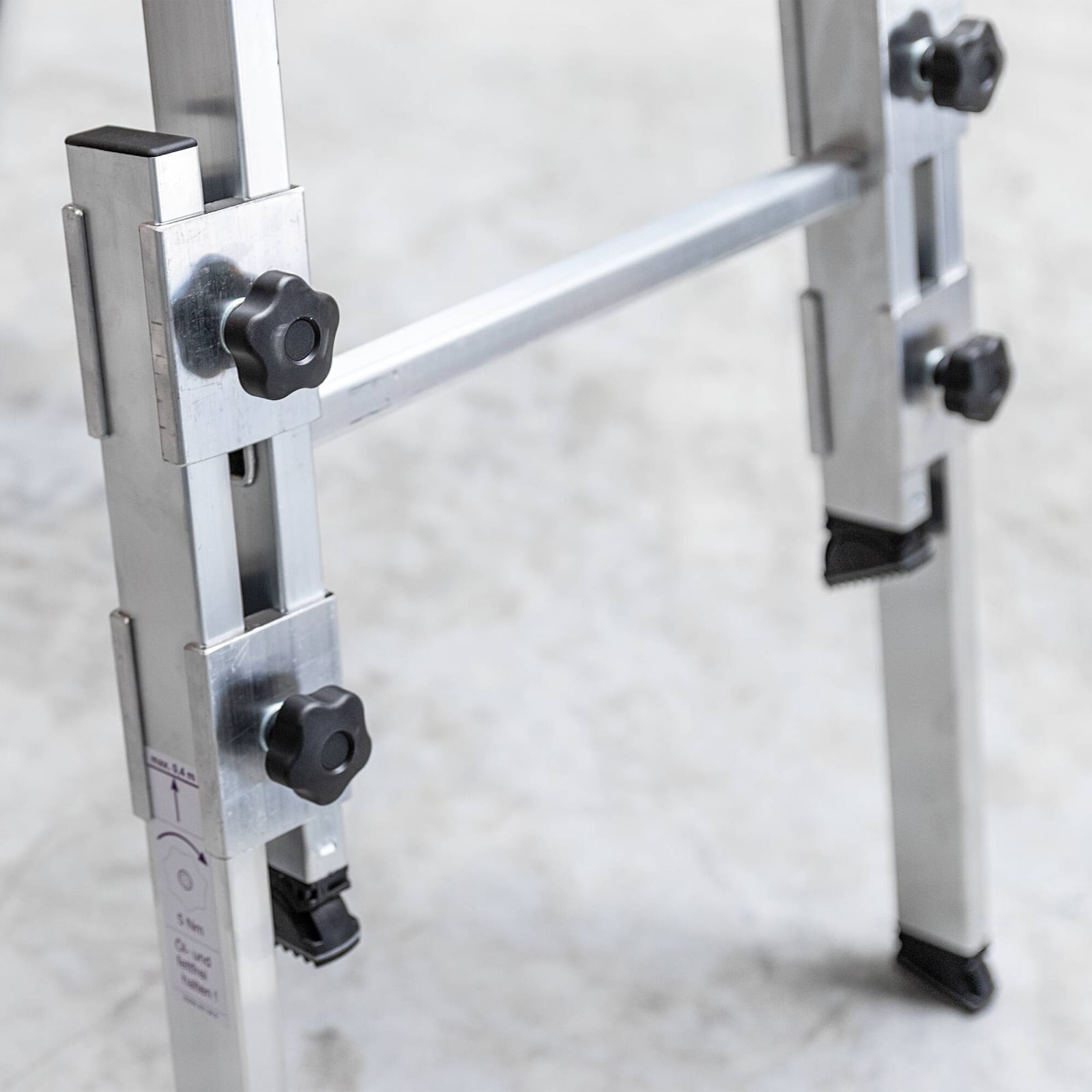 - Vier Holmverlängerungen mit solider Schiebeführung, stufenlos per ergonomischem Sterngriff verstellbar