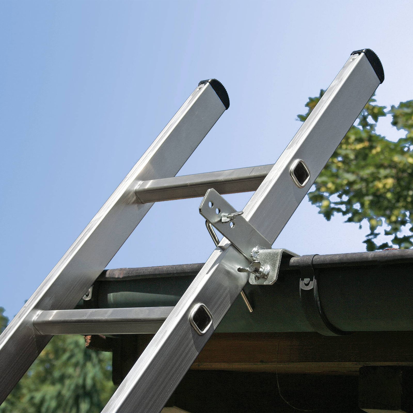 - Sichert die angelehnte Leiter zuverlässig nach allen Seiten, ohne den Leiterholm zu klemmen