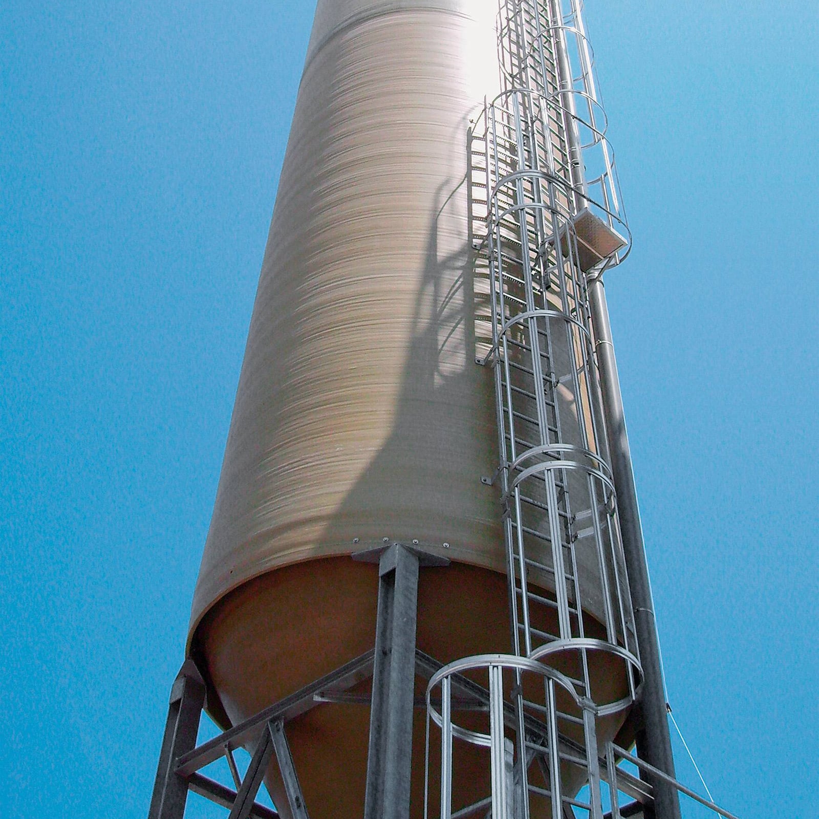 - Die Verbindung zum Steigschutz muss von einem gesicherten Standplatz aus herzustellen und zu lösen sein. Ein gesicherter Standplatz ist z. B. ein Podest mit Geländer und einem gesicherten Zugang.