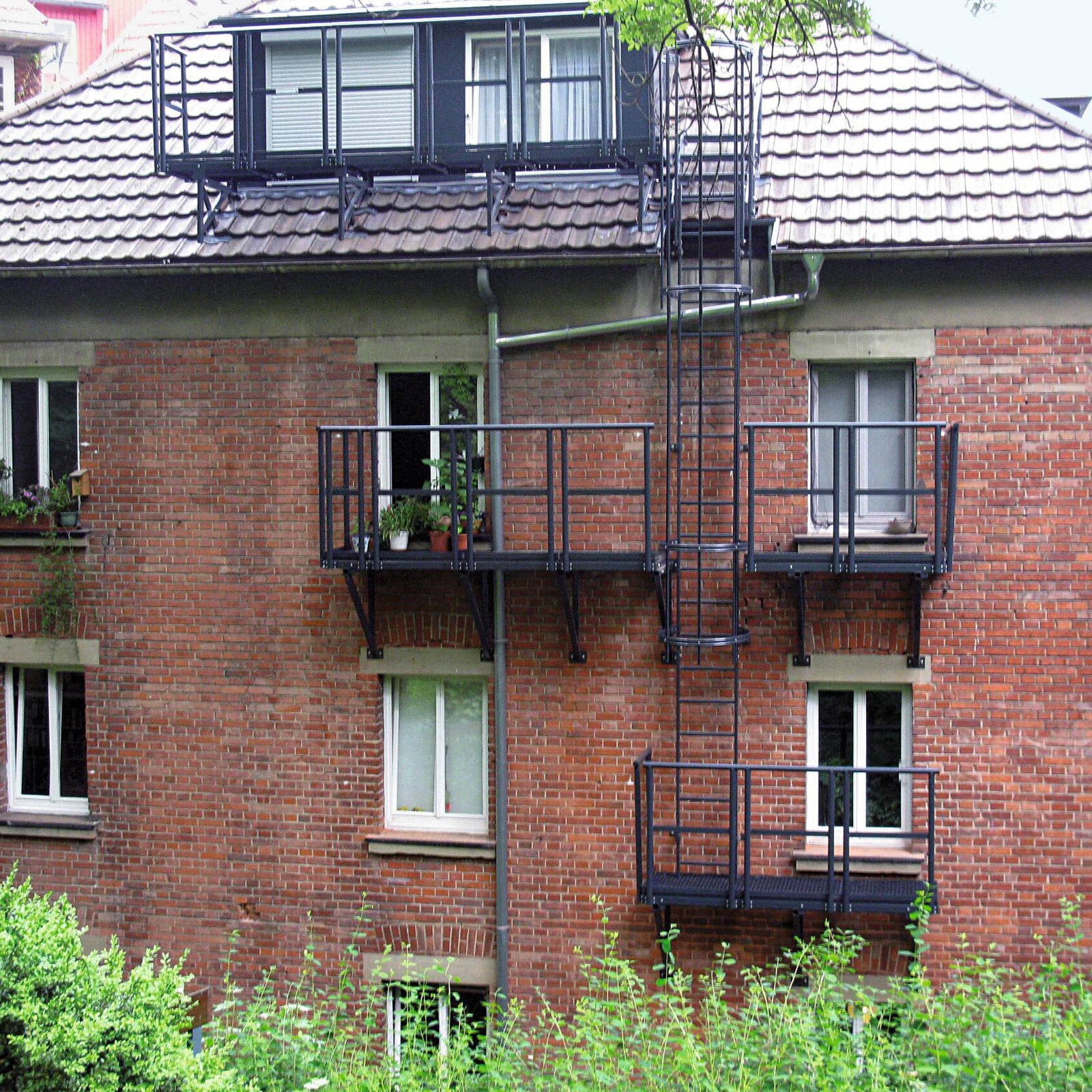 - Die Notsteigleiter sollte auf tragfähigen, für Fluchtwege vorgesehene gesicherte Flächen, die aus den Gefahrenbereichen führen, enden