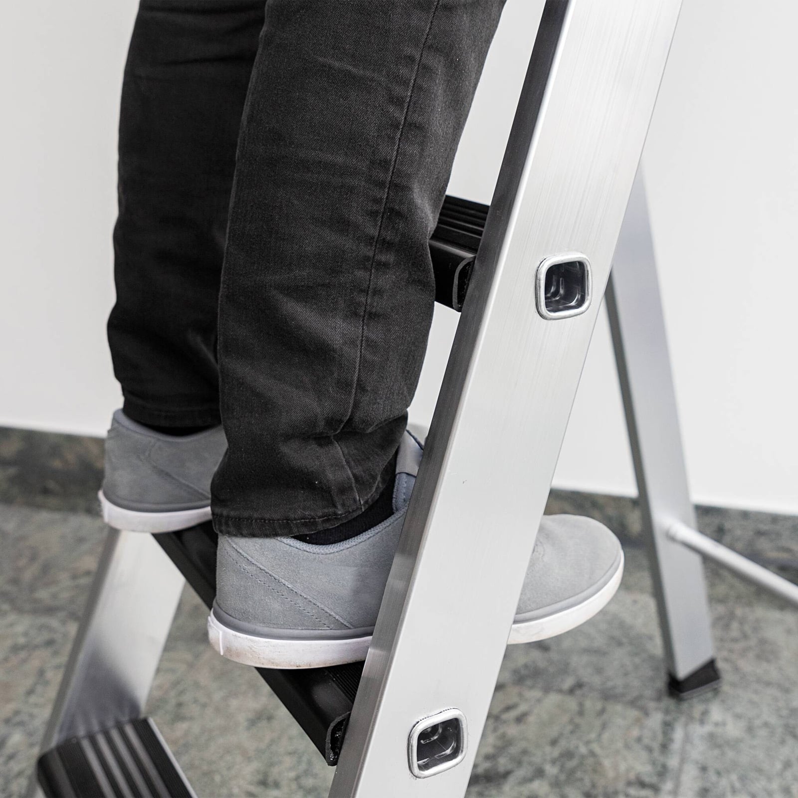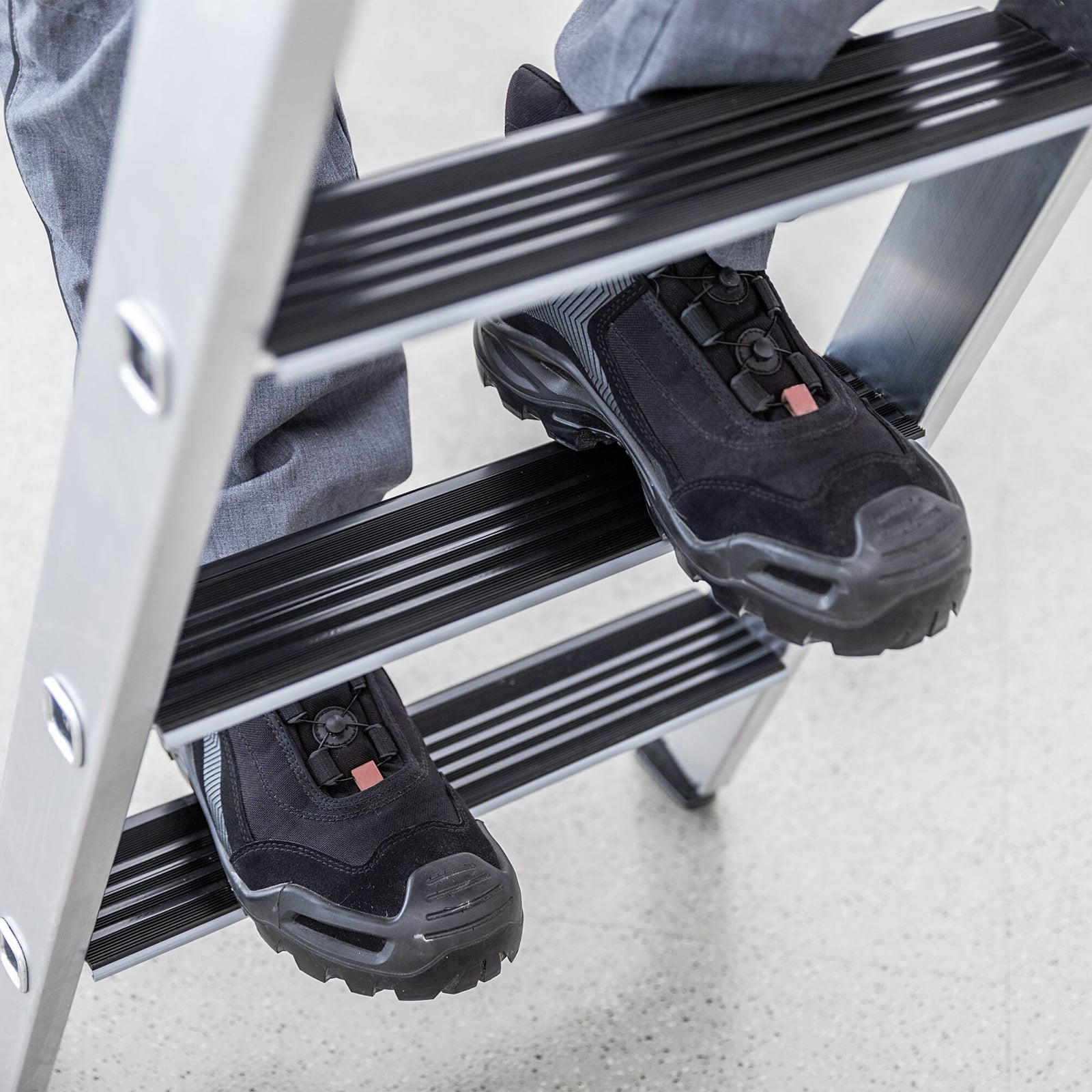 - Komfortables Stehen: Die Trittauflage polstert durch ihre spezielle Geometrie die Vorderkante der Stufe und erhöht so den Komfort für den Anwender – insbesondere bei länger währenden Arbeiten auf der Leiter