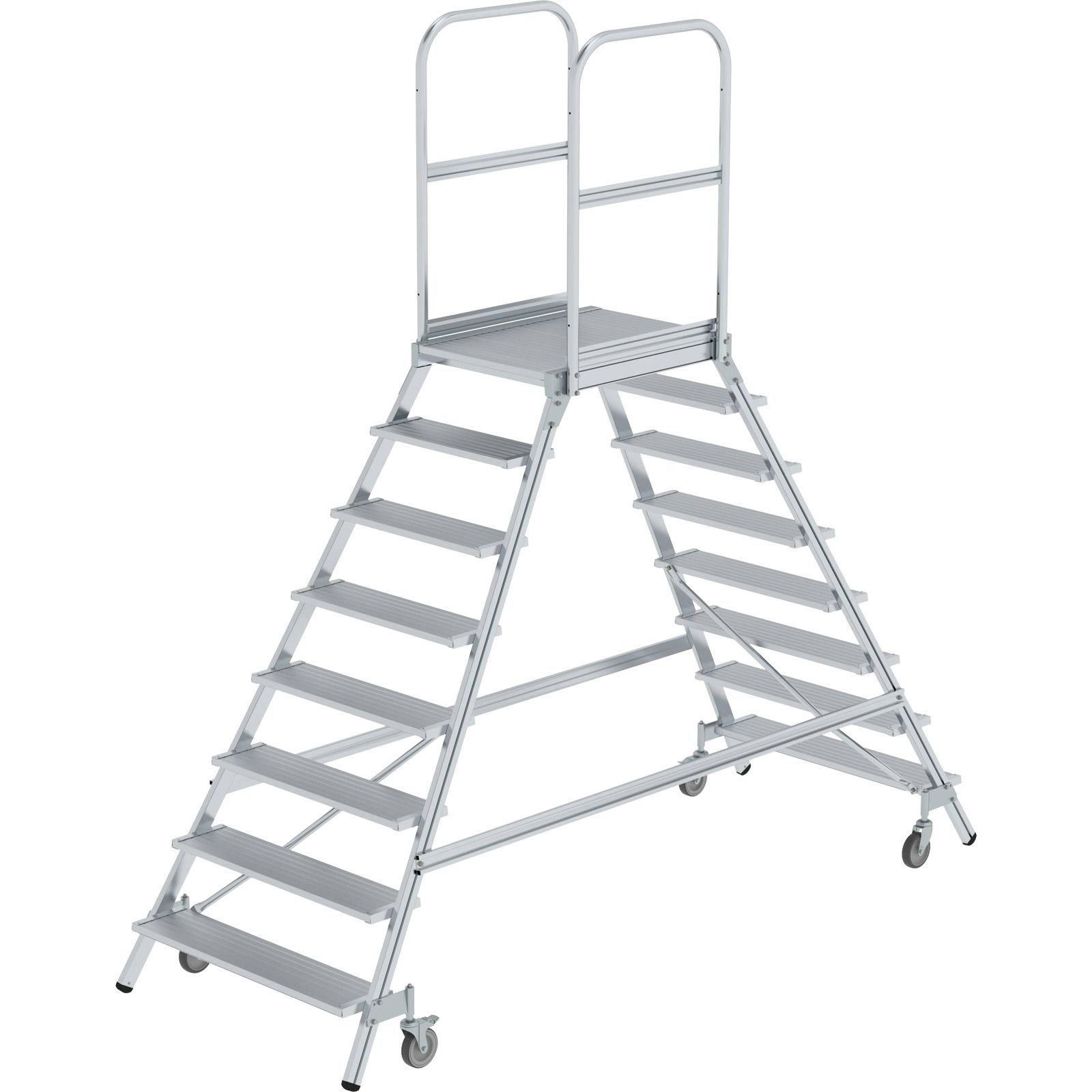 1x Günzburger Steigtechnik Podesttreppe beidseitig begehbar mit Federrolle Aluminium geriffelt 2x8 Stufen