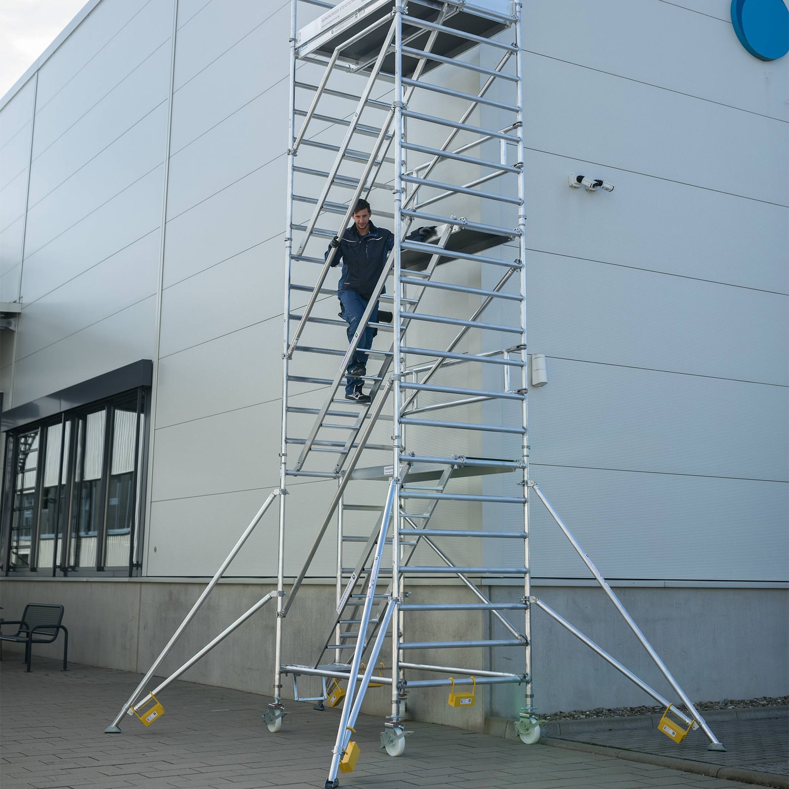 - Rollgerüst aus stabilem Aluminium-Rundrohr mit geschweißten Rahmenteilen