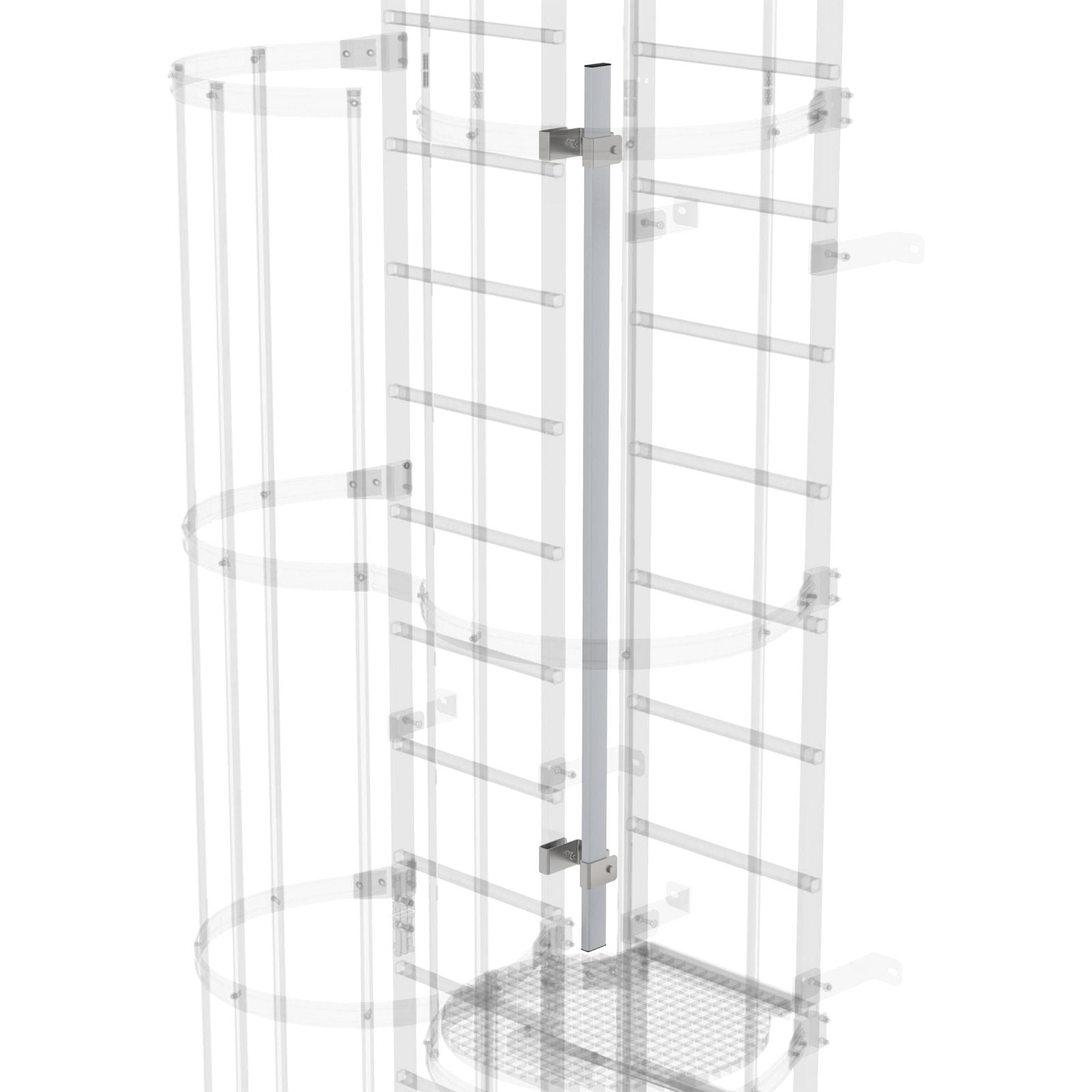 - Nach DIN EN ISO 14122 muss der Zwischenraum mit einem zusätzlichen Steigleiterholm gesichert sein