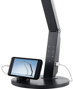 Moderne und multifunktionelle LED Leuchte. 4 verschiedene Stufen der Farbtemperatur wählbar. Mit USB Anschluss (5V · 1.2A) zum Aufladen aller Arten von mobilen Geräten. Leuchte ist um 180° drehbar. Magnetischer Smartphone-Halter kann bei Bedarf an Fuss befestigt werden. Dieses Produkt enthält eine Lichtquelle der Energieeffizienzklasse E und diese kann nicht ausgetauscht werden.