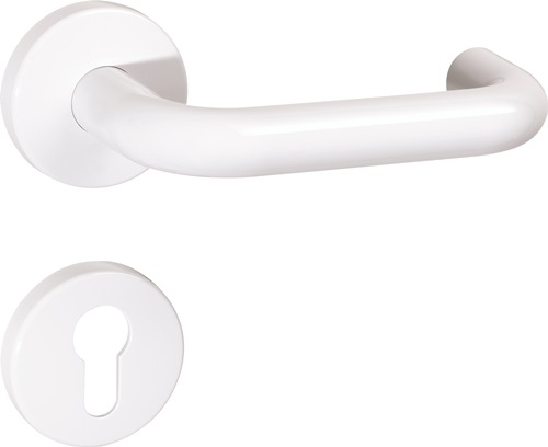 - in R-Technik mit Rosetten nach DIN 18255 und DIN EN 1906 aus Polyamid, Oberfläche hochglänzend, bestehend aus: Türdrücker in U-Form aus Polyamid mit durchgehendem Stahlkern bis in das Drückerende, durchgängig eingefärbt, Durchmesser 20 mm, mit Ansatzführung und Rastnut, Montage durch einfaches Einrasten der Türdrücker in die auf der Tür vormontierten Unterteile. Die Rastung kann mittels Demontageschlüssel wieder gelöst werden. Der Drücker erfüllt die Vorgaben der DIN EN 179 und DIN 18040. Rosettenunterkonstruktion in Kunststoff-Edelstahlverbundbau, DIN links und DIN rechts verwendbar. Festdrehbarlagerung der Drücker mit selbsttätig einrastender Rundumverriegelung und 5 mm Lagerstelle als wartungsfreies Gleitlager mit elastischem Ausgleichsbereich und zweiter Lagerstelle im Drückerhals. Verdeckte, lockerungssichere Verschraubung mit M4 Schraubenund Hülsenschraubenkombination sowie Stützzapfen. Rosetten-Abdeck-Kappe, rund, aus Polyamid durchgängig eingefärbt, Durchmesser 55 mm, 13 mm hoch, gewölbt, 1,5 mm Wandstärke. Ausgelegt und geprüft für den Objektbereich, Gebrauchs-Kategorie nach DIN EN 1906 Klasse 4 Garnitur mit Vierkantstift 8 mm