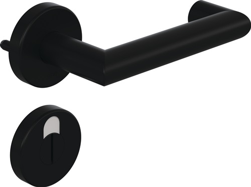 - in R-Technik nach DIN 18255 und DIN EN 1906 aus mattem Polyamid, bestehend aus: Türdrücker 165.21PBR, Durchmesser 21,3 mm und Rundrosetten 305.21PBR und 306.23PBNR