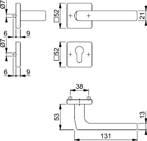 - Türgriffe mit Schnellstift-Verbindung (8 mm Vierkant) für Türstärke 37-42 mm und Rückholfeder