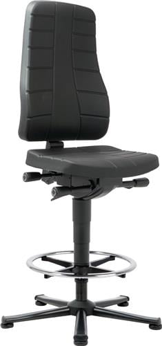 nach DIN 68877 bedienungsfreundliche Gasfeder-Sitzhöhenverstellung ergonomisch geformte Sitzfläche und Rückenlehne (extrahoch 600mm) Synchronmechanik mit Gewichtsregulierung Sitz in Neigung, Höhe und Tiefe verstellbar Neigungs- und höhenverstellbare Rückenlehne Sitz und Rückenlehne mit robustem Integralschaumpolster , beständig gegen leichte Säuren und Laugen, leicht abwaschbar Untergestell mit abriebfesten Kunststoff-Bodengleitern und höhenverstellbarem Fußring für erhöhte Sitzposition